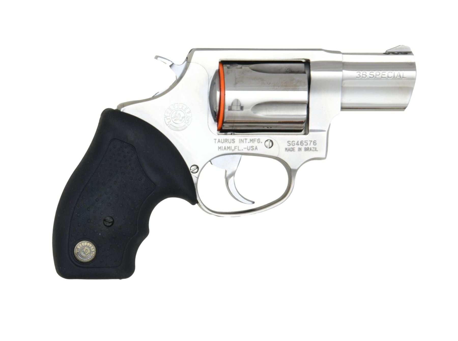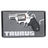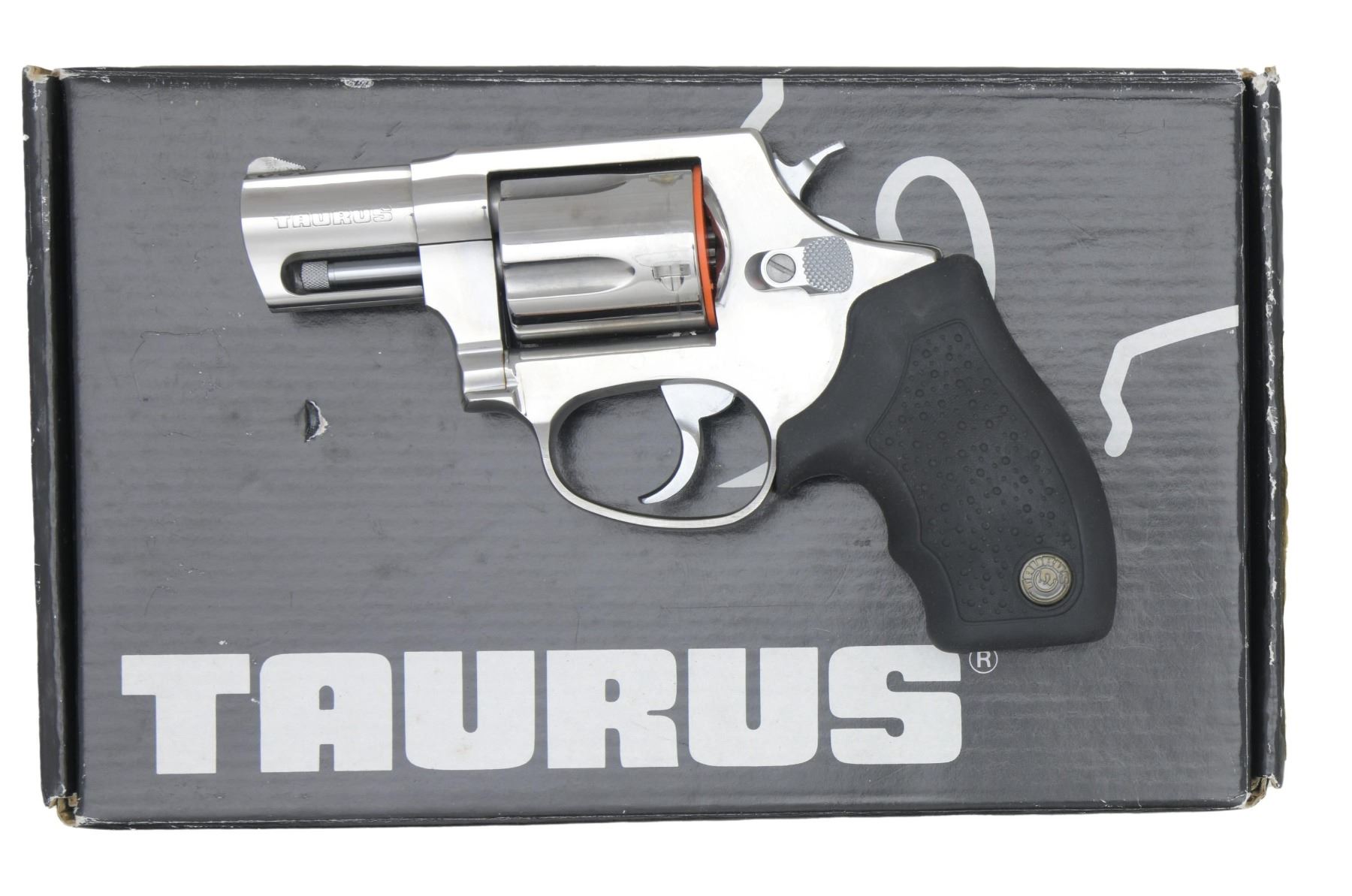 MATCHING FACTORY BOX. Cal. 38 Spcl. S# SG46576. Bbl. 2". Model 85 double action revolver, mfg. in Brazil by Taurus and imported by Taurus International. Left side of bbl. is marked "TAURUS", with the cal. designation marked on the right. Right side of the frame is marked with the Taurus logo, Taurus' importer information, as well as the S# above "MADE IN BRAZIL". Metal components exhibit a polished and matte stainless steel finish overall. Frame is mounted with a 2-piece textured black rubber grip. UNATTACHED ACCESSORIES: matching factory box containing factory paperwork. CONDITION: very good, with metal components retaining the majority of their original factory finish, exhibiting few light superficial handling marks, with a small area of mild surface oxidation present on one of the cyl. flutes. Very bright bore, exhibiting a few small spots of firing residue while retaining well-defined rifling throughout. Grip is very good overall. Box exhibits superficial exterior wear from handling and storage but otherwise remains sturdy and serviceable. PROVENANCE: the estate collection of Charles Wagner. (24-4686/MLW). MODERN. $300-400.