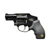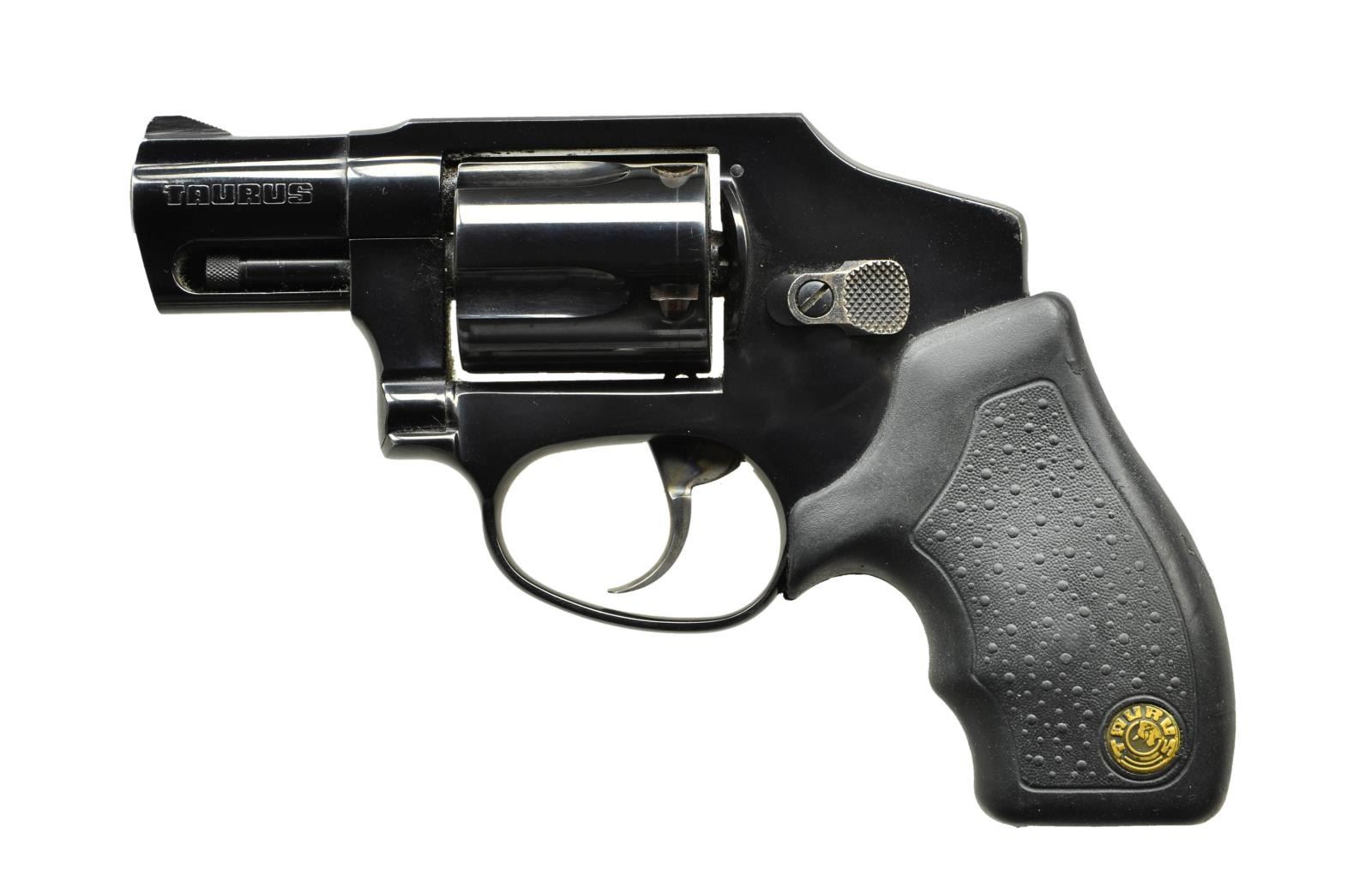 Cal. 38 Special. S# UG18713. Bbl. 2". DAO steel frame with fixed sights, dark matte blue finish with case colored trigger. Black pebble textured factory grips with Taurus monogram. CONDITION: metal retains about 95% factory blue with a light dragline on the cylinder. Grips retain strong texture. Bore is very good, bright and strongly rifled. (22-4668/CW). MODERN. $200-300.