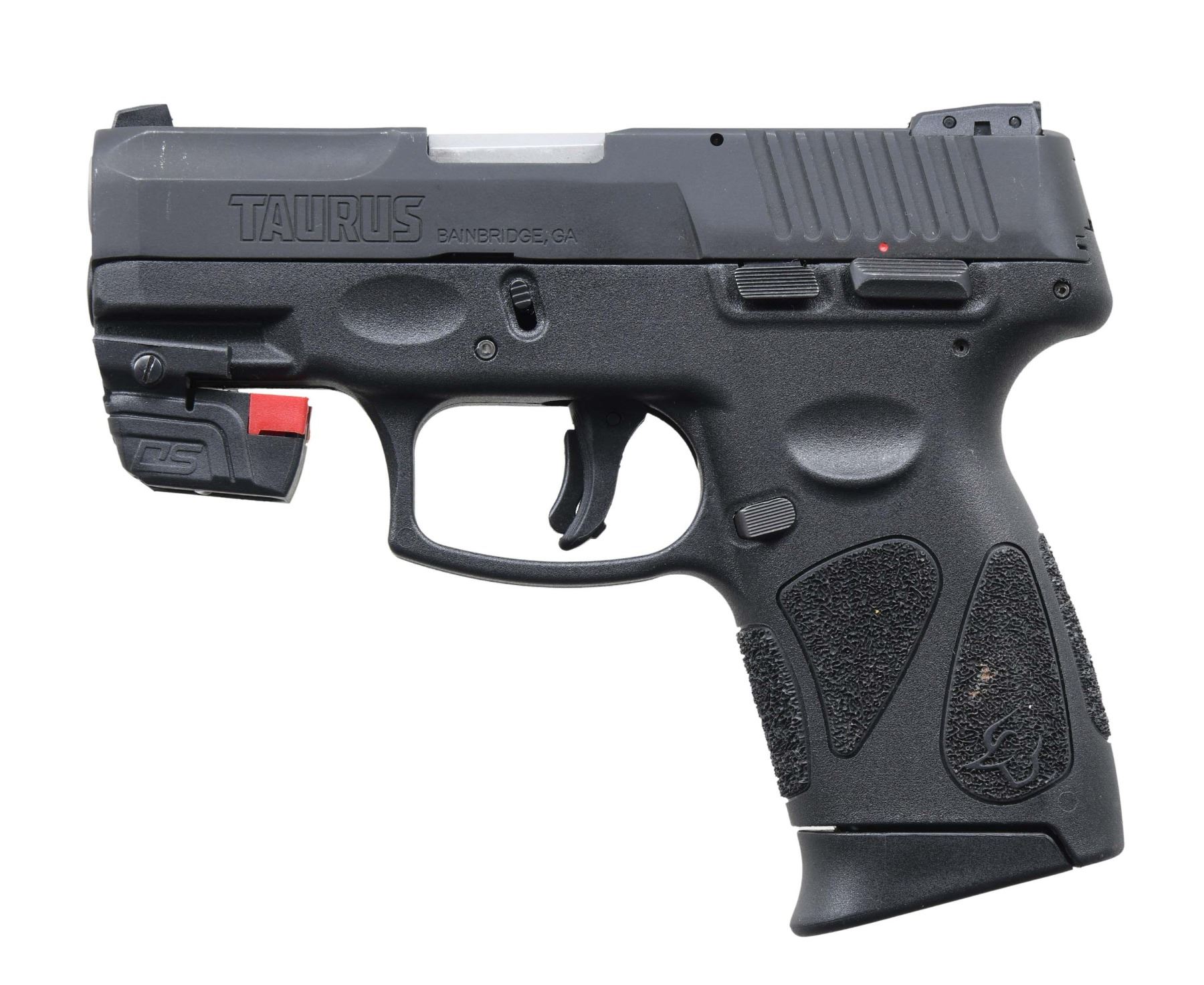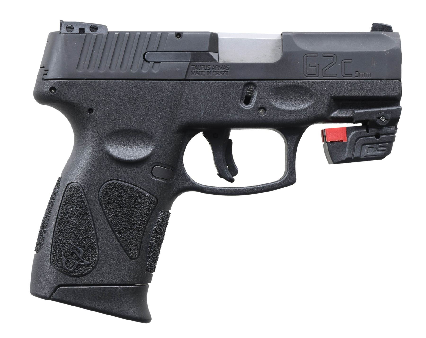 Cal. 9x19mm. S# 1C076919. Bbl. 3 1/8". Model PT111 G2A semi-automatic pistol mfg. by Taurus in Brazil and imported by Taurus. Left side of the slide is marked "TAURUS," followed by "BAINBRIDGE, GA," with Taurus mfg. information, followed by G2c 9mm" marked on the right. Underside of the frame is marked with the S#, above "MOD. PT111 G2A." Slide exhibits a matte black finish, with the bbl. exhibiting a matte stainless steel finish overall. Textured polymer frame. Blade front sight with square notch rear sight. Frame rail is mounted with a Crimson Trace red laser sight. MAGS: one 12-rd. CONDITION: metal components retain bountiful amounts of their original factory finishes, exhibiting some superficial handling marks overall. Mirror bore, exhibiting well-defined rifling throughout. Polymer frame is very good overall, showing a few superficial marks from handling and storage. (24-6375/MLW). MODERN. $200-300.
