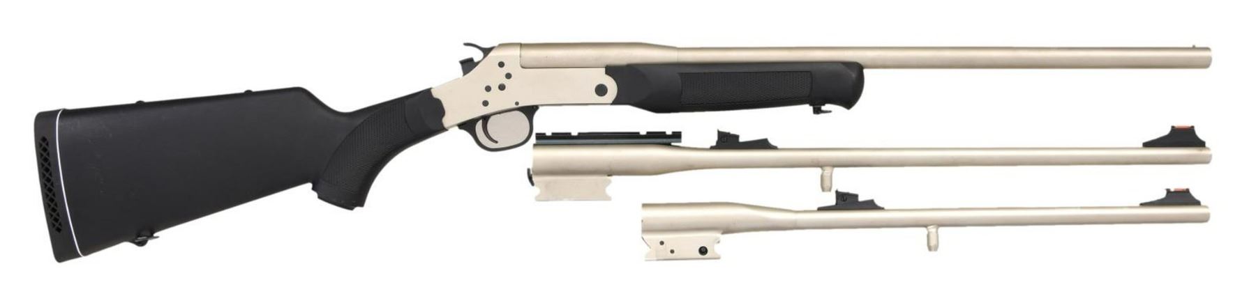 BARRELS & SOFT CASE. Cal. 20 GA, 3". S# S2022243NBS. Bbl. 22". Single shot shotgun mfg. by Taurus and imported by BrazTech L.C. of Miami, FL. Right side of frame is marked "MADE IN BRAZIL/ BY TAURUS" and with BrazTech's importer information, with the left side exhibiting the serial number. Top of bbl. is stamped "ROSSI" followed by the cal. designation over the breech. Stainless steel finish with checkered black polymer pistol grip buttstock and forend. UNATTACHED ACCESSORIES: soft case containing 1 .22 LR bbl. and 1 .243 Winchester bbl. CONDITION: metal components retain the majority of their original factory blue finish, exhibiting scattered superficial marks from handling and storage, with spots of light oxidation overall. Mirror bore. Polymer furniture shows some minor handling marks, but is otherwise very good overall. Spare bbls. exhibit light spots of oxidation and retain mirror bores with well defined rifling throughout. PROVENANCE: From the Estate of Harry Henry. (23-5104/MLW). MODERN. $150-250.