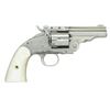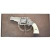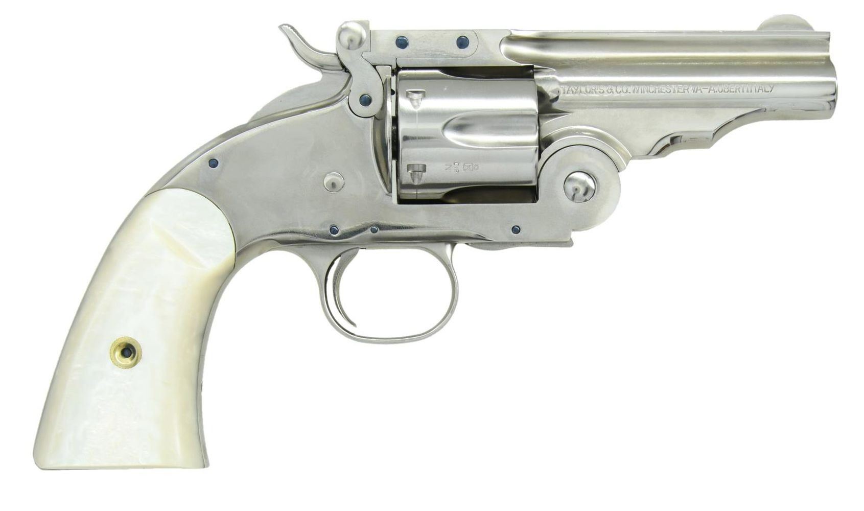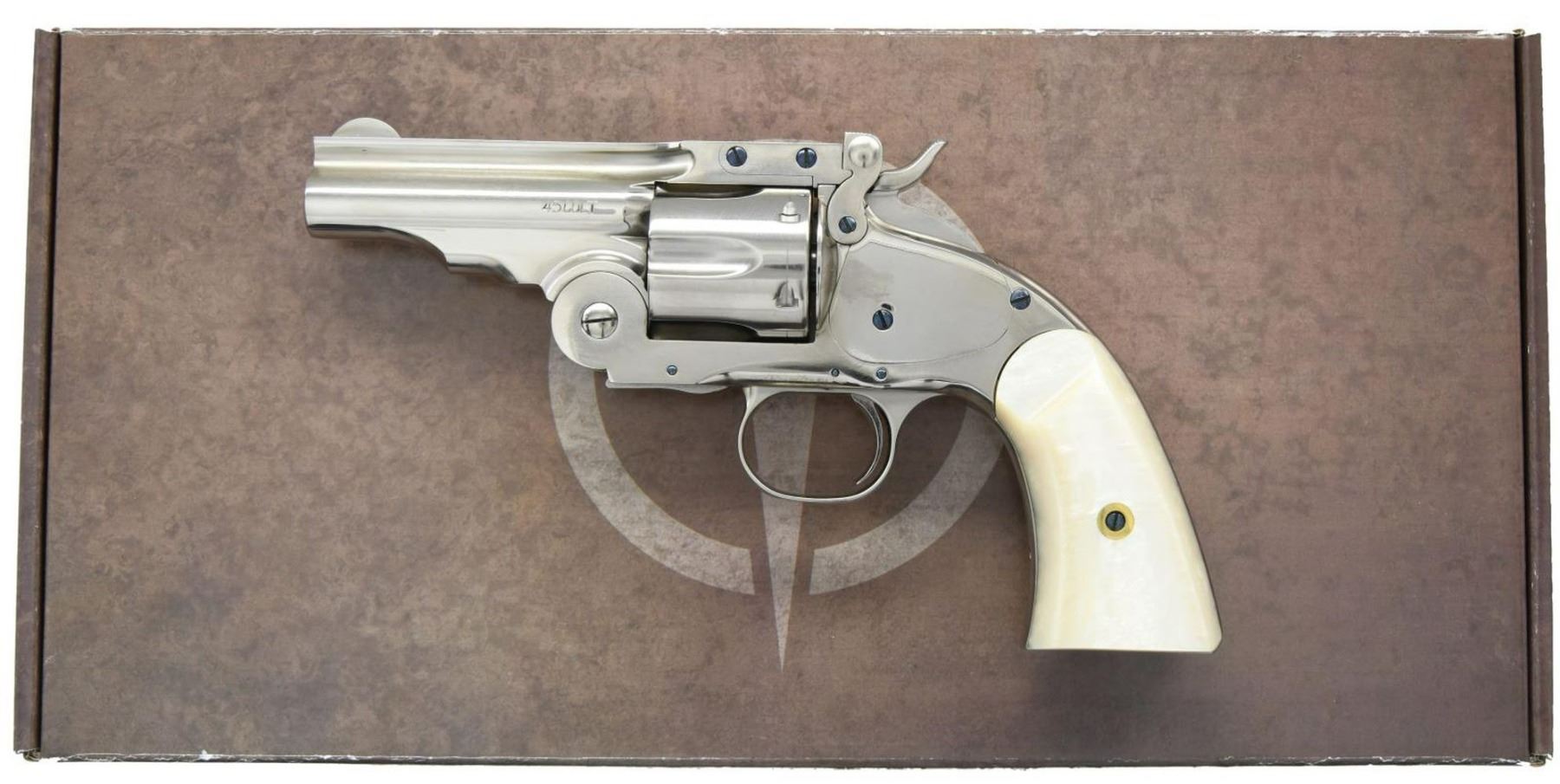 Cal. 45 Colt. S# F24714. Bbl. 3 1/2". Round blade front sight. Fixed rear sight. Uberti made Schofield style revolver imported by Taylor. Nickel finish w/ fire blued screws. Simulated pearl grips. Bottom of grip frame marked "U.S.". UNATTACHED ACCESSORIES: matching numbered factory box w/ softcase, cable lock & manual. CONDITION: all aspects near excellent. PROVENANCE: the Collection of Gun Sport Ltd owned by Jon R. Thomas. (23-3880/MJC). MODERN. $700-1000.