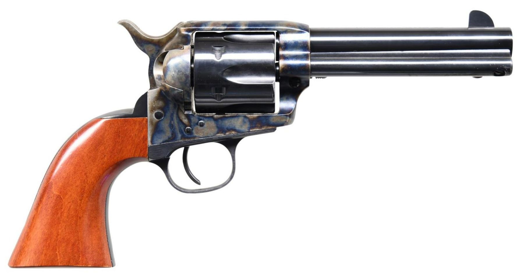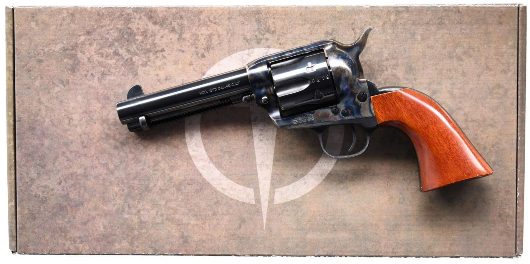 Cal. 45 Colt. S# UN0279. Bbl. 4 3/4". Blade front sight. Fixed rear sight. Uberti made 1873 SAA style revolver imported by Taylor's. Case colored frame, hammer & loading gate. Other parts have blued finish. Smooth walnut grips. UNATTACHED ACCESSORIES: matching numbered factory box w/ softcase, manual, paperwork & cable lock. CONDITION: left grip panel shows a notable ding at bottom, grips show some light flaking & handling wear. Other aspects rate near excellent. PROVENANCE: the Collection of Gun Sport Ltd owned by Jon R. Thomas. (23-3980/MJC). MODERN. $300-500.