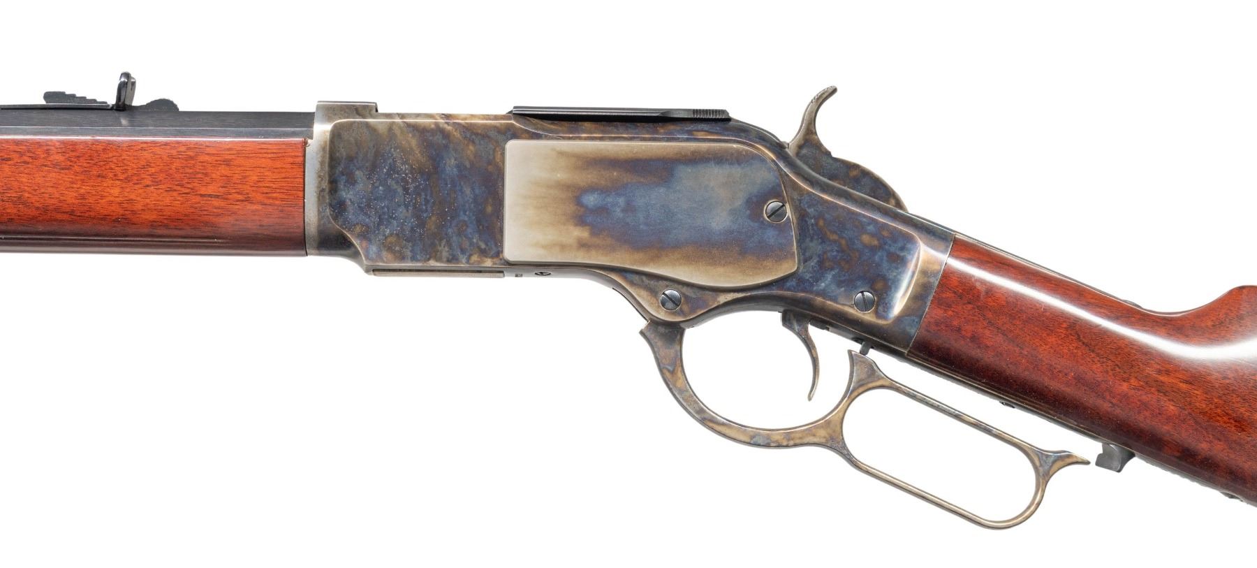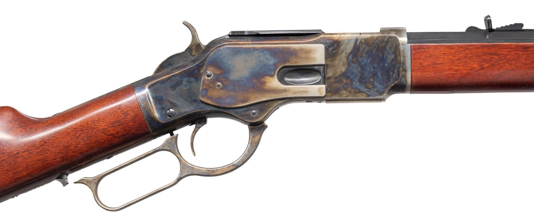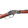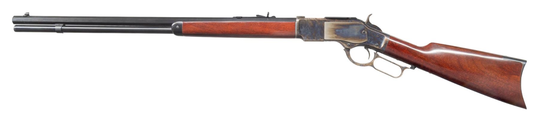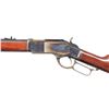 Cal. 45 Colt. S# W31117. Bbl. 24 1/2" oct. Blade front sight. Sporting style rear sight. Made in Italy by Uberti & imported by Taylors. Blued bbl. & mag assembly. Case colored action. Walnut stock set. UNATTACHED ACCESSORIES: La Flair leather scabbard. CONDITION: stock set shows some light handling marks. Metal shows some light handling & operational wear. Action functions properly when hand cycled. Near excellent bore. (25-6200/MJC). MODERN. $1,100-1,600.