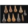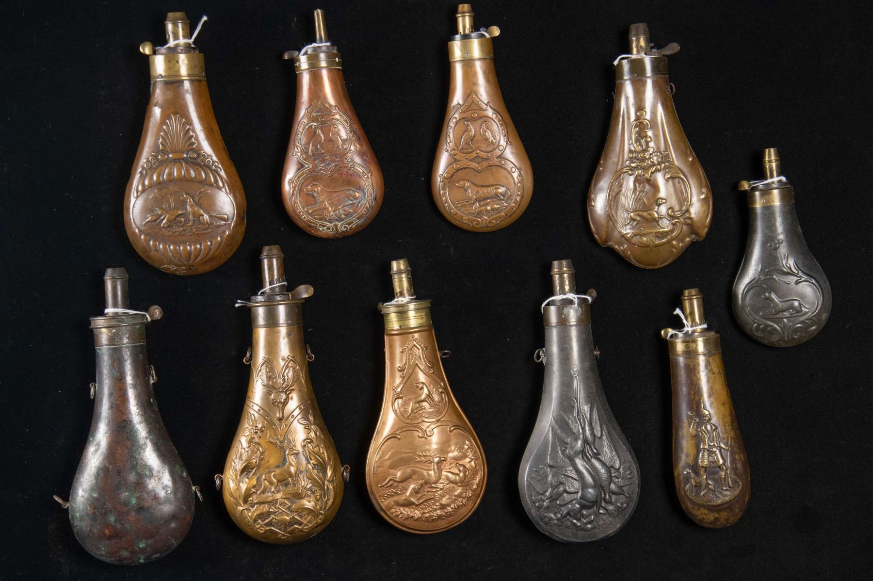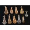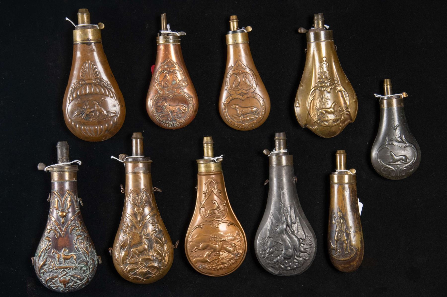 1) 8" deer and deer head, Riling 988. 2) 7" dog & game, tagged Riling 600. 3) 8" dogs & deer head, "MATHESSON" Riling 570. 4) 7.75" dogs chasing deer, Riling 984. 5) 7.5" white metal, hanging game, Riling 622. 6) 6.5" dog, Riling 901, broken spring. 7) 6.5" hunter in kilt with horn & dog, Riling 879. 8) 5.25" zinc, Riling 874, embossed dog. 9) 6.25" dog & pheasants, Riling 884, broken spring. 10) 6" dog & pheasants, Riling 884. CONDITION: good overall. (02-25910/JS). NON-GUN. $800-1,200.
