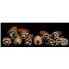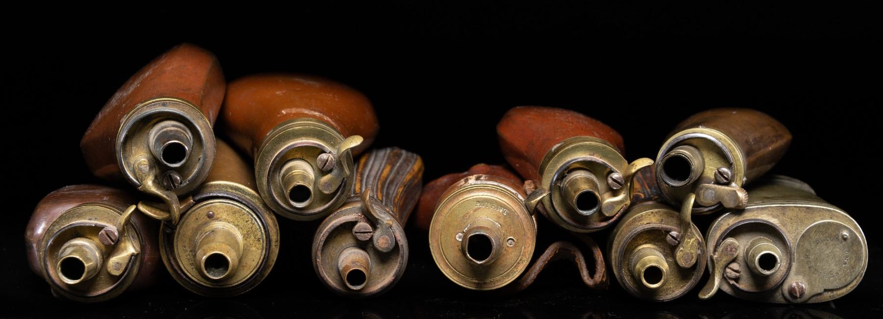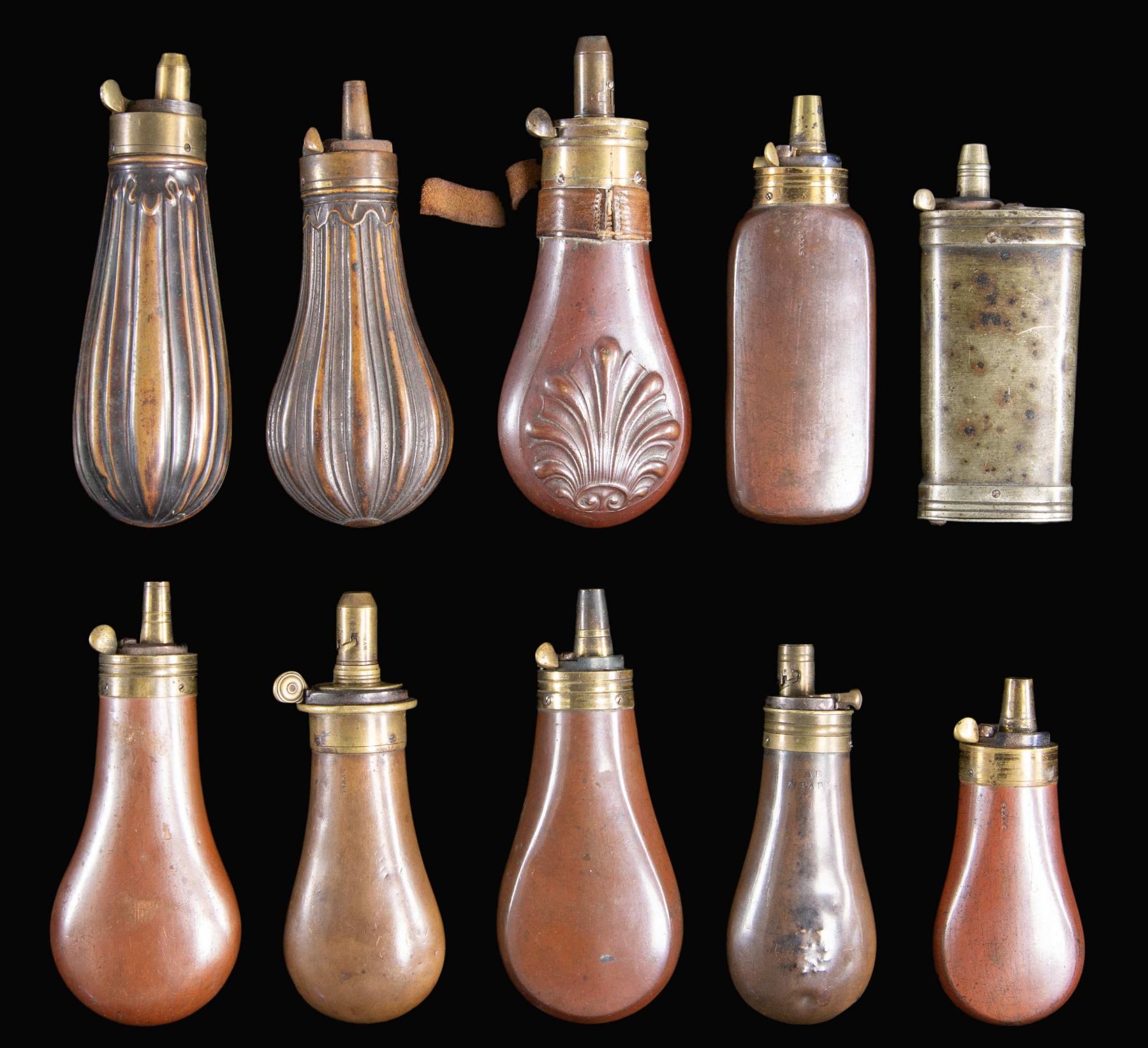 10 flasks ranging from 3" to 5" including: 3" Sykes with most varnish retained, 4.5" Skyes, 5" clamshell decorated Patent marked with leather collar & much varnish, white metal 4" Dixson hallmarked 3-compartment, 3.75" "AB Paris". CONDITION: good to very good overall. PROVENANCE: The Esteemed Norm Greenberg Collection. (02-24848-15/JS). NON-GUN. $800-1,200.