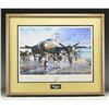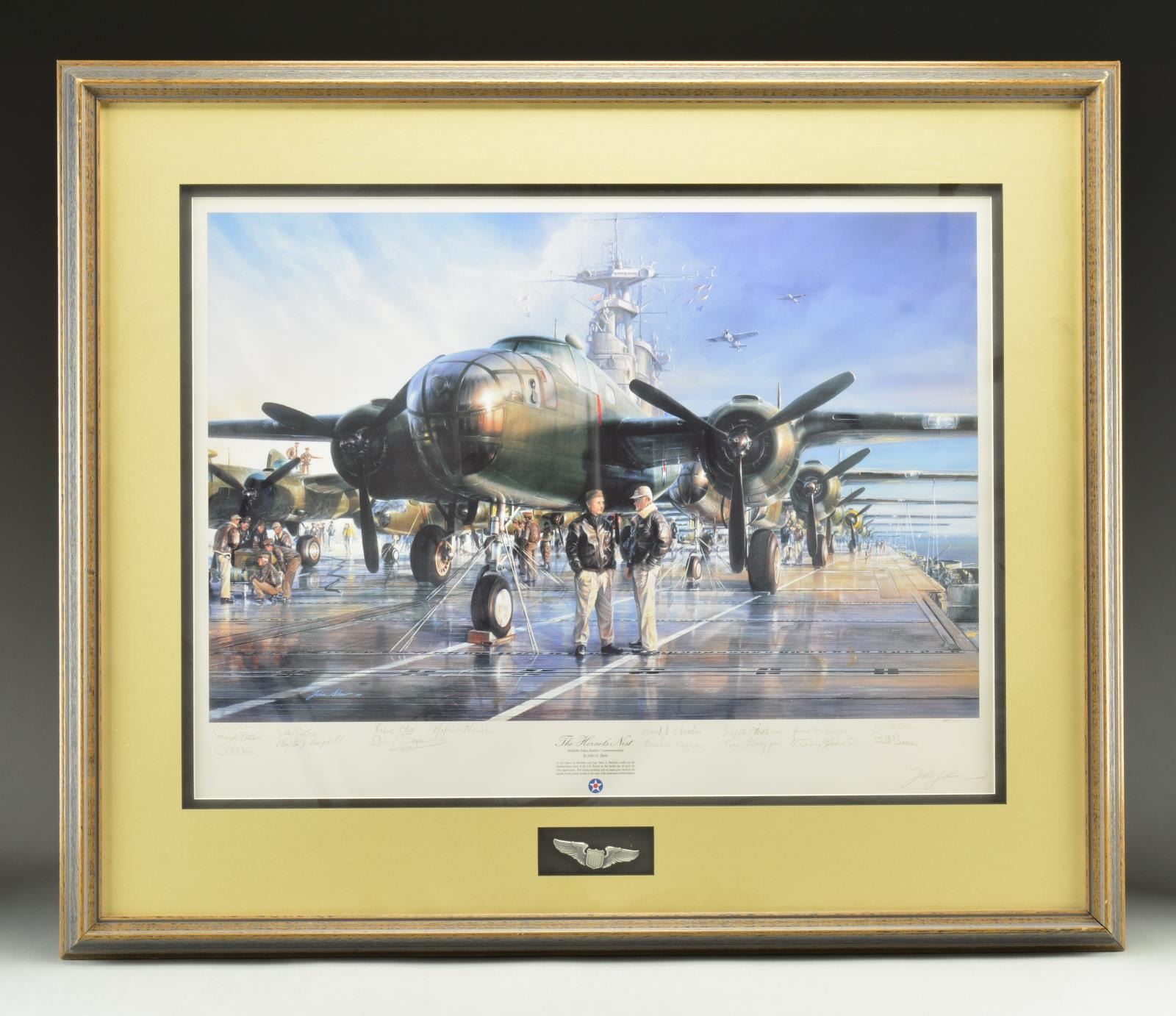 Framed print by John D. Shaw & numbered 499 out of 1500. The print shows Lt. Col. James Doolittle conferring w/ Capt. Marc Mitscher on the deck of the USS Hornet on the day of Doolittle's famous raid. Several B25 Mitchell bombers & various personnel are present in the background. The print includes an Army Aviator badge & certificate of authenticity. The print is signed by several Doolittle raiders including Hank Potter, Richard Cole, Clayton Campbell, Robert Hite & Thomas Griffin. The frame measures 37" x 31". The brown paper backed frame shows light wear. (02-16953-7/MJC). $200-400.