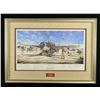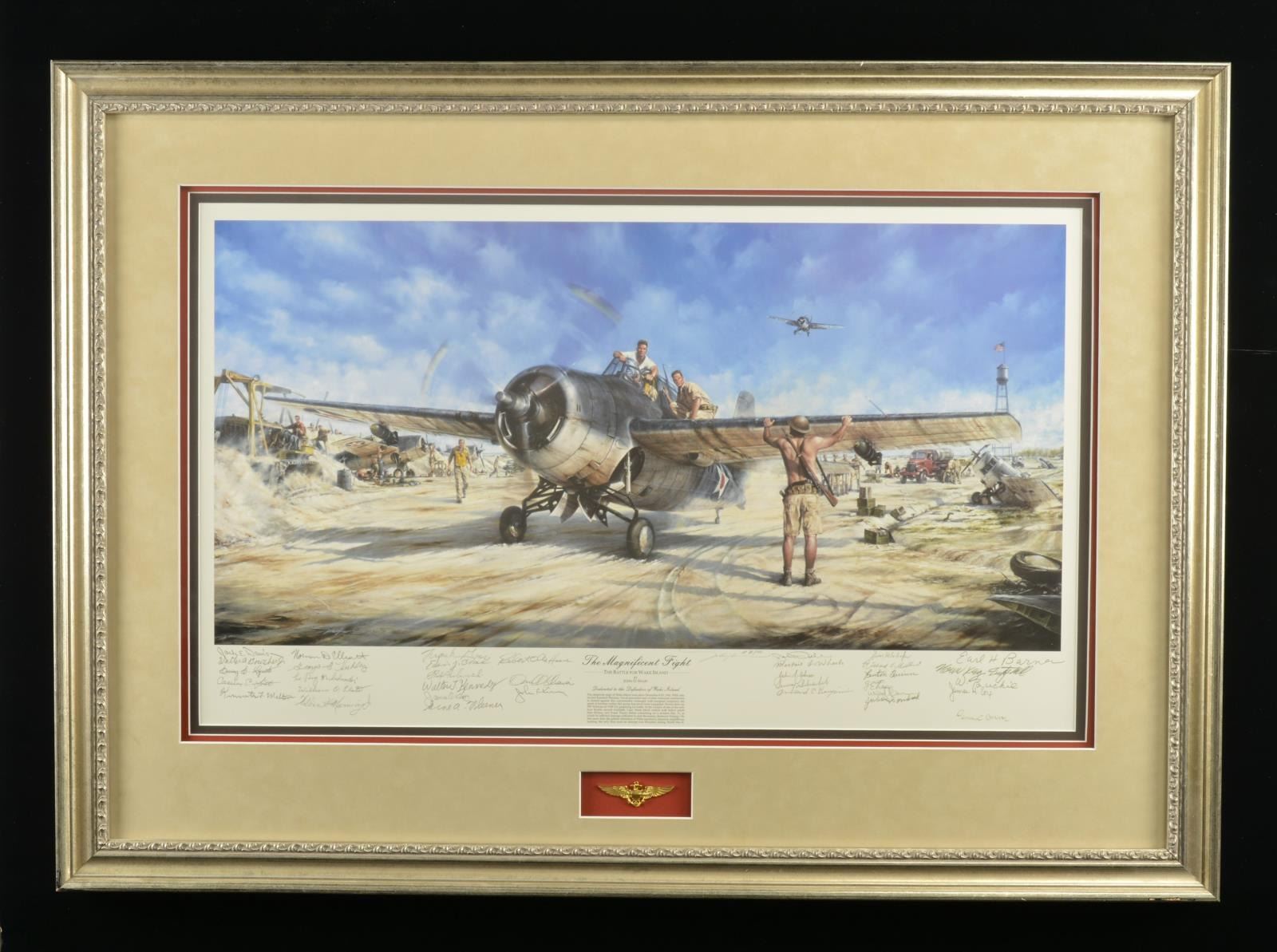 Framed print by John D. Shaw. This print depicts the Marine Air Strap on Wake Island during the battle & its hectic conditions. Shown prominently are a Marine directing an F4F Wildcat w/ a 1903 Springfield rifle on his back & the carnage of the Japanese attacks. The print is numbered 80/100 & includes a Navy Aviator badge. The print is signed by several Wake Island veterans. The frame measures 42" x 30". The back of the frame has some tape repairs. (02-16953-8/MJC). $200-400.
