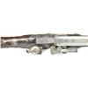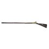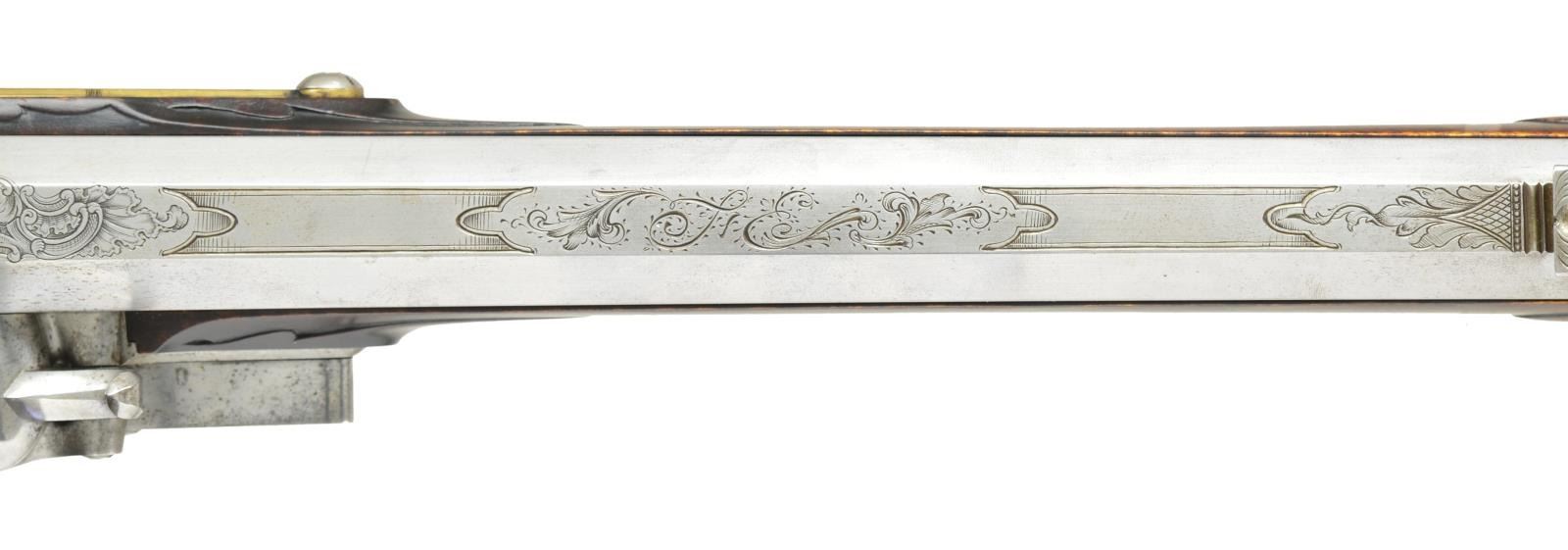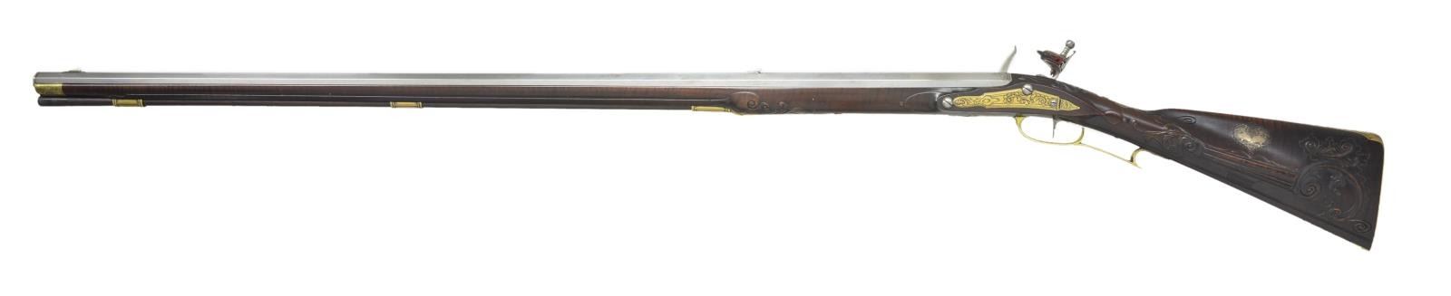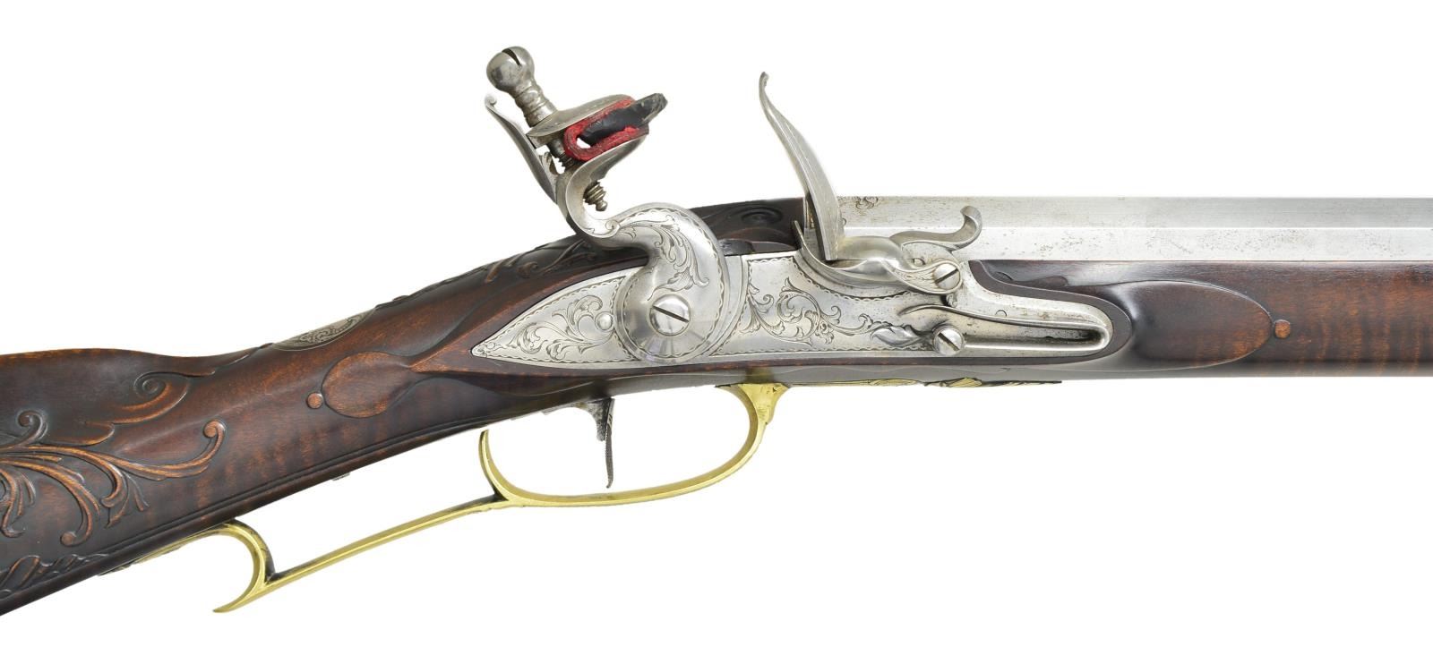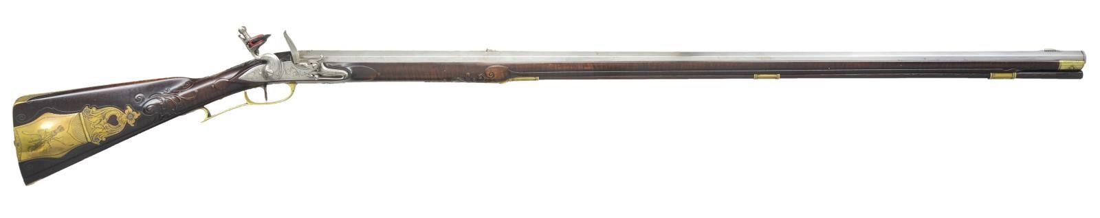 Cal. 65. S# NSN. John Ennis is a self-trained custom gunmaker with roots in traditional handwork who built his first rifle at the age of sixteen. He taught himself engraving with the aid of James Meek's book "The Art of Engraving". To further the development of his talent he attended gunsmithing school in Colorado. He was a tool & die maker for the aerospace industry in the late 1980's. He started restoring antique rifles in the 90's. He also built complete rifles and branched into making custom spurs and knives. This beautifully finished rifle is not a copy of any particular style but it incorporates elements that Ennis favored. It has 42" swamped octagon barrel fitted with "U" notch rear and silver bead front sights. Top flat is engraved with very well done large shaded scroll with shell and acanthus highlights surrounding the initials "J.E.". Handmade early style flint lock with rounded plate has well filed serpentine cock, semi-waterproof pan, bridled friction frizzen and feather spring with flame finial. Lock and cock are engraved with large open scroll. Stock of curly grain hard maple is brass mounted. Mounts include early style trigger guard with foliate finial, wide buttplate with early style top tang and a unique two piece patchbox treatment with very attractive heart pierced finial and box cover with high "turtle shell" dome. Release is at center of buttplate. These fittings are also beautifully engraved with classic shells and scrolls as well as some floral highlights. Engraving on patchbox cover is of intertwined bow, quiver of arrows, tomahawk and cutlass. Silver wire inlay outlines patchbox. Stock is relief carved with Rococo tendrils of acanthus scroll and other stock elements around barrel tang and fancy beaded right hand cheekpiece. A silver heart is inlaid at face and there is a silver crestplate at top of grip. Stock extends to muzzle with brass cap and is pinned to barrel. Horn tipped rosewood ramrod with beautifully finished worm on tail, mounts through two octagonal beaded pipes and matching thimble. All workmanship is of the highest order, beyond reproach. CONDITION: exceptionally fine retaining nearly all maker applied finishes to wood and metal. Barrel and lock retain over 95% original bright polish with some areas of light staining. Stock is exceptionally fine with only three or four light scratches in its original oil finish, brass is nicely toned. Bore is bright and shiny throughout, lock is crisp. Simply stated, this is a beautiful rifle. This rifle is pictured on page 80 of the September/October 2014 "Muzzleloader" magazine in an article on John Ennis entitled "Talent.Versatility.Excellence". 01-21924/MGM). ANTIQUE. $8,000-12,000.