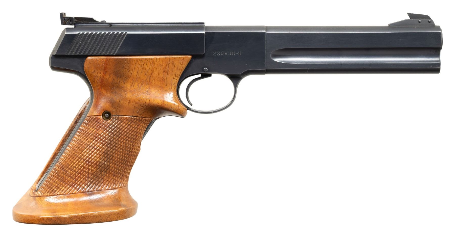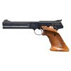 SEMI-AUTOMATIC PISTOL. Cal. 22 LR. S# 230830-S. Bbl. 6". Third Series Woodsman Match Target semi-automatic pistol mfg. by Colt in 1968. Left side of the bbl. is marked with Colt's single line address. Left side of the receiver is marked with the Rampant Colt logo above "MATCH TARGET", with the S# marked on the right. Left side of the slide is marked "COLT", followed by "AUTOMATIC/ CAL. 22 LONG RIFLE". Metal components exhibit a blue finish overall, with the top strap of the frame, slide, and bbl. exhibiting a matte blue finish. Frame is mounted with 2-piece aftermarket checkered wood grips, featuring a thumb rest on the left panel and a flared butt on the right. Ramped patridge blade front sight with Eliason adj. square notch rear sight. MAGS: 1 10-rd. CONDITION: metal components retain the majority of their original factory blue finish, exhibiting some light to mild edge wear, scattered superficial handling marks, as well as some scattered spots of light surface oxidation. Grip straps show some patches/areas of light to mild wear and thinning that is fading to gray patina. Mirror bore, retaining well defined rifling throughout. Proper manual mechanics. Grips show some superficial marks and impressions, but otherwise remain sound. PROVENANCE: Estate of Groves Herrick. (25-5690/MLW). CURIO. $500-800.