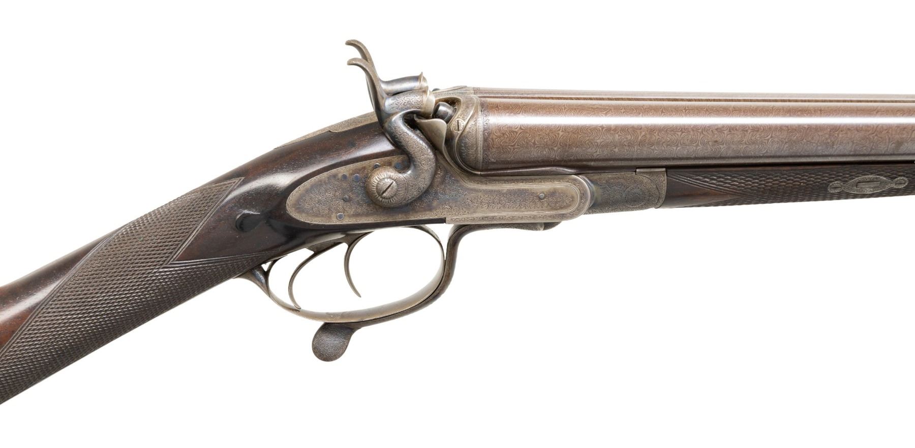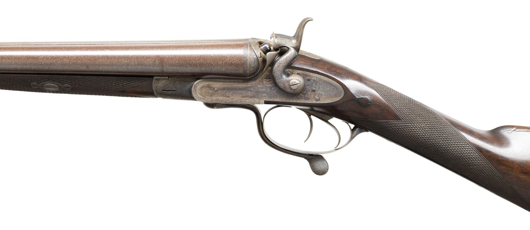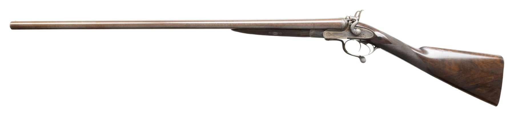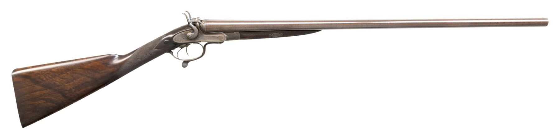 SHOTGUN. Cal.12ga, 2 1/2". S# 9417. Bbl 29 5/8" of fine damascus steel with Birmingham proofs. Steel front bead. Rib is marked "Thomas Norfolk, 9, Meat Mkt, Bury St. Edmunds.". Address marking is preceded by a large "2" indicating this is gun 2 of a two gun matched pair. Sidelock underlever exposed hammer action with rebounding locks. Sculpted frame having high fences. Re-case colored finish. Action, hammers and fittings have near full coverage, fine English scroll engraving. Triggerplate is marked "Re-Engraved by P. Duffill, 2012". Double triggers, extractors. Wedge fasten splinter forearm iron tip. Wedge and escutcheons have complimentary engraving. Straight hand stock of fine English walnut with drop points and hand checkering having a German silver shield in the toeline. LOP: 14 1/2" over a steel shotgun butt with matching engraving. DAC: 2 15/16". DAH: 4 1/8". Stock has approx. 2 1/2" cast off for central vision. Bore Diameter: (R) .729. (L) .729. Choke Constriction: (R) .015. (L) .015. Minimum Wall Thickness: (R) .031. (L) .031. WEIGHT: 6lb, 11.2oz. Thomas Norfolk was recorded at the Bury St address in 1855.CONDITION: bbls retain 95% finely browned finish. Action has over 80% appropriately lightly faded case colors showing edge wear. Stocks have good refinish showing scattered scratches and marks with lightly refreshened checkering. Action is tight with sound locks. Bores are generally bright showing small spots of pitting. (01-28485/DS). ANTIQUE. $1,000-1,500.