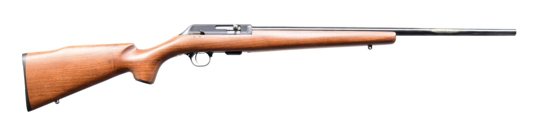 Cal. 22 LR. S# 3869. Bbl. 22". Rifle is devoid of sights, but the receiver and bbl. are drilled for sight mounting. Blued finish. Walnut stock with bottom-mounted sling studs. MAGS: one 5rnd. CONDITION: stock shows a few light handling marks. Metal retains 92% blue with a notable cleaned patch of light pitting on the right side of bbl., a few other spots of light oxidation, and some edge wear. Action is functional when hand-cycled. Very good+ bore. (24-3218/MJC). MODERN. $300-500.