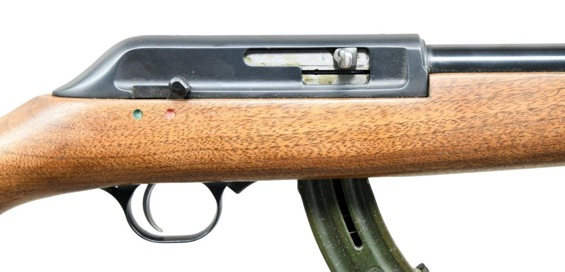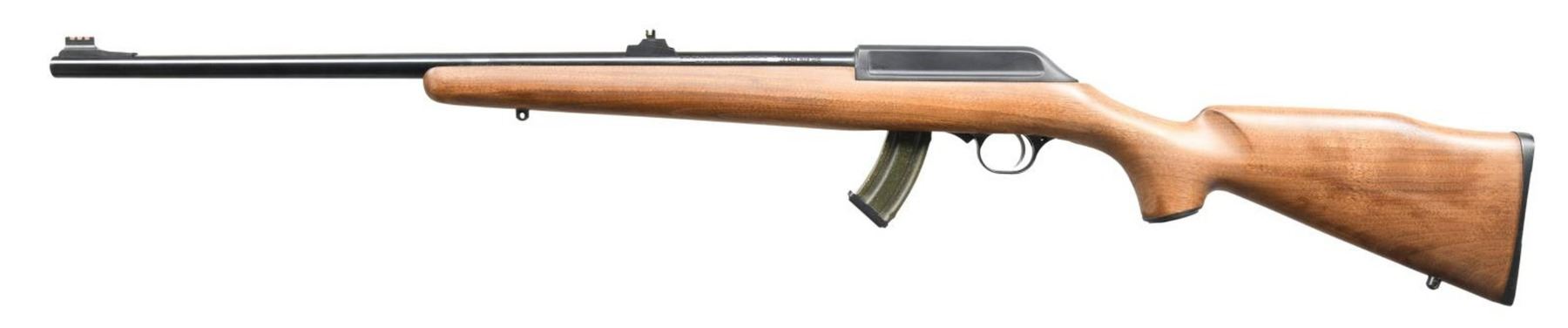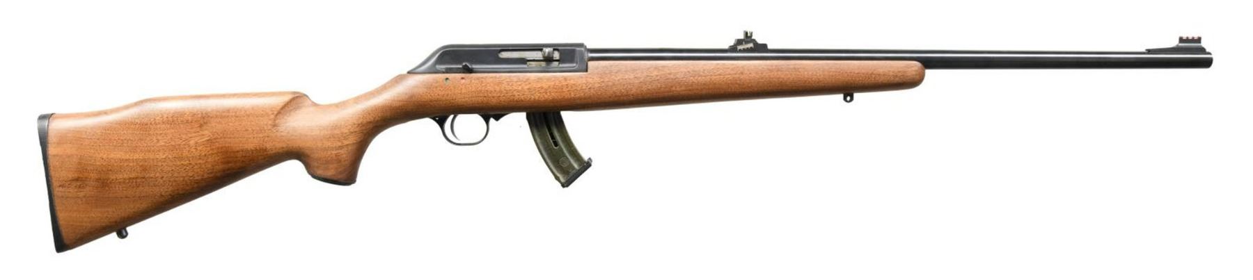 Cal. 22 LR. S#16544. Bbl 22 1/4". 22 Classic semi-automatic rifle mfg. by Thompson Center Arms. Top of bbl. is marked with the model designation "22 Classic", with Thompson Center's mfg. information and the cal. designation on the left. Blued finish, with 1 piece wood pistol grip stock. Red fiber optic front sight with green fiber optic rear sight. MAGS: 1 10 rd. 2 5 rd. CONDITION: excellent, with metal components retaining bountiful amounts of their original factory blue finish overall. Mirror bore with well defined rifling throughout. Stock shows few minor marks from storage and handling. (23-4843/MLW). MODERN. $250-350.