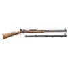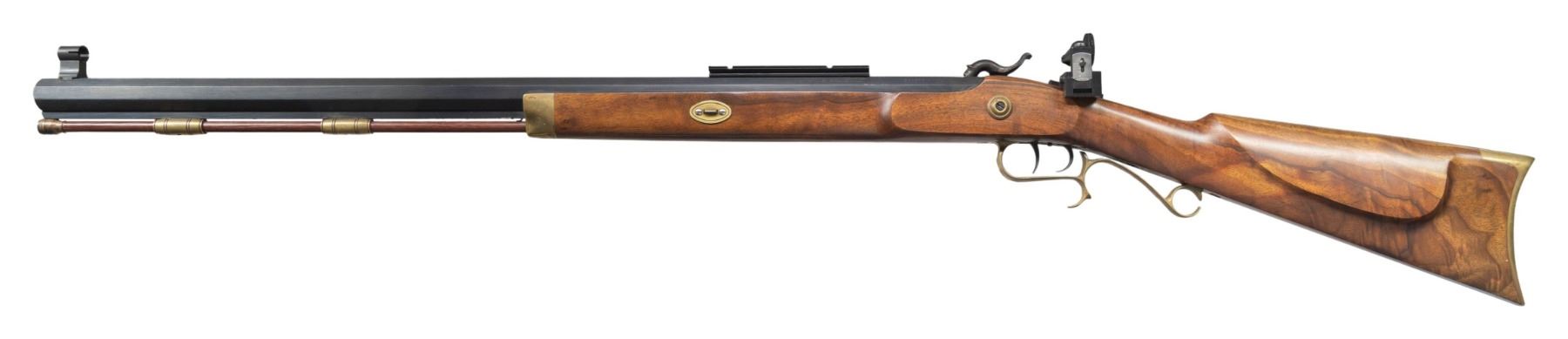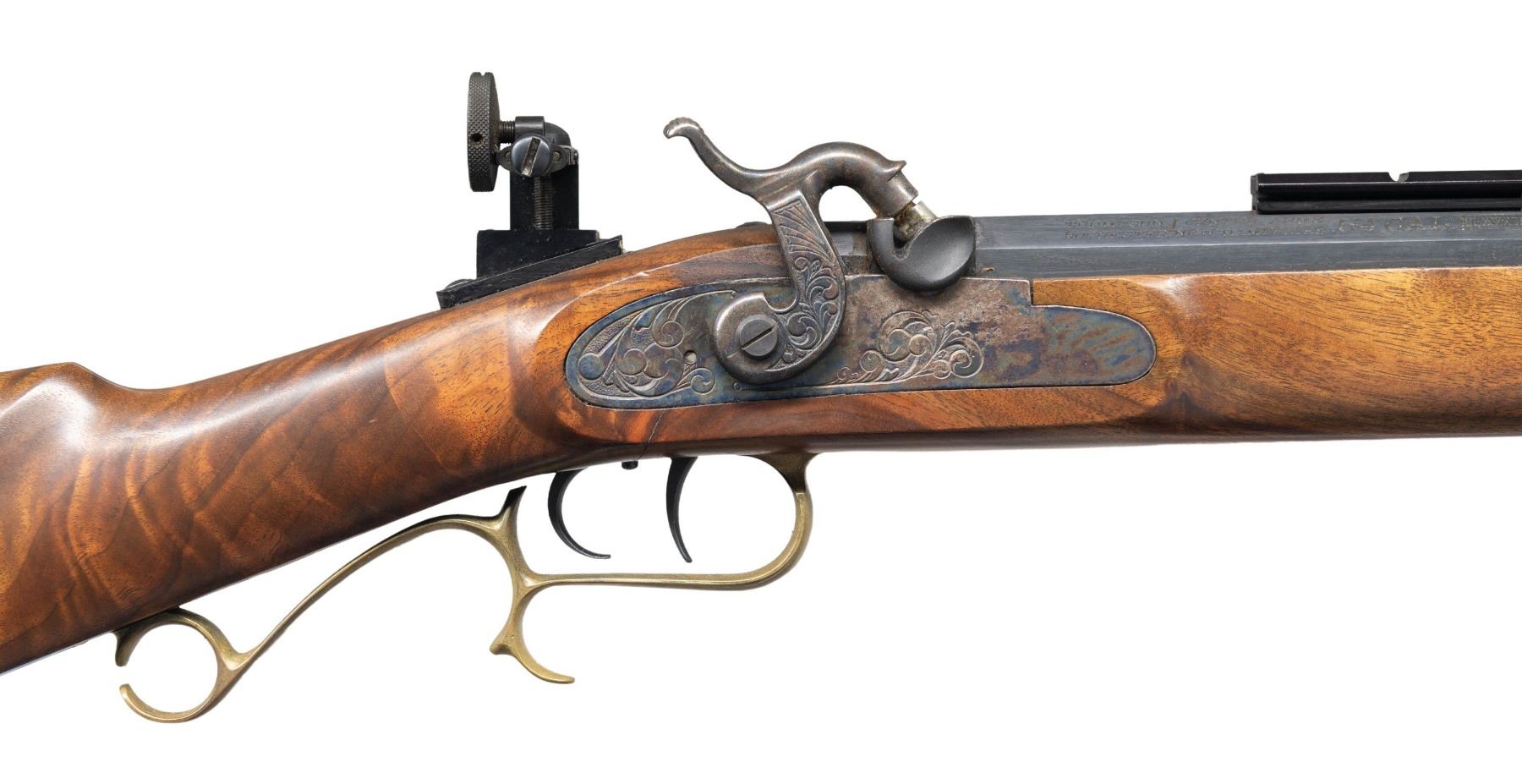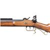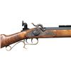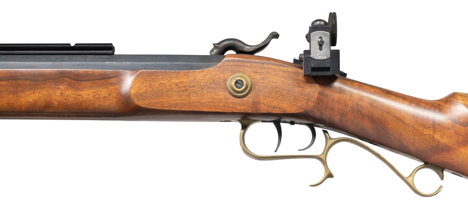 PERCUSSION RIFLE. Cal. 54. S# 504303. Bbl. 29" oct. No front sight present but hood is present. Tang mounted Lyman aperture rear sight. Bbl. has Weaver style scope rail. 25th Anniversary Hawken Percussion rifle made in 1995. Case colored lock & hammer. Blued bbl. & double set trigger. Brass furniture. Hardwood half-length stock. Ramrod present. UNATTACHED ACCESSORIES: spare 36 cal. bbl. with hooded front sight, adjustable rear sight & ramrod. CONDITION: stock shows some light handling wear & marks. Lock retains most of its case colors with some light oxidation & operational wear. Brass parts are turning a dull yellow color with some tarnishing. Blued parts retain 97% finish with some handling marks & light edge wear. Action functions properly when hand cycled. Very good bore with strong rifling. Spare bbl. shows scattered edge wear, light oxidation & notable fading to gray at rear. Spare bbl. bore has strong rifling. PROVENANCE: From the Buckstix Collection. (01-28648/MJC). ANTIQUE. $450-650.