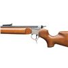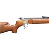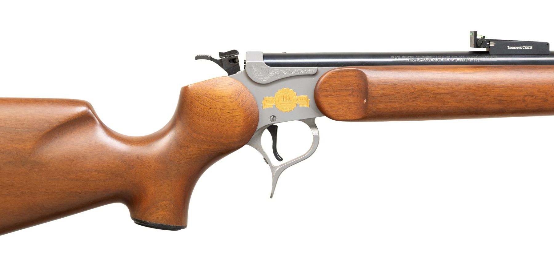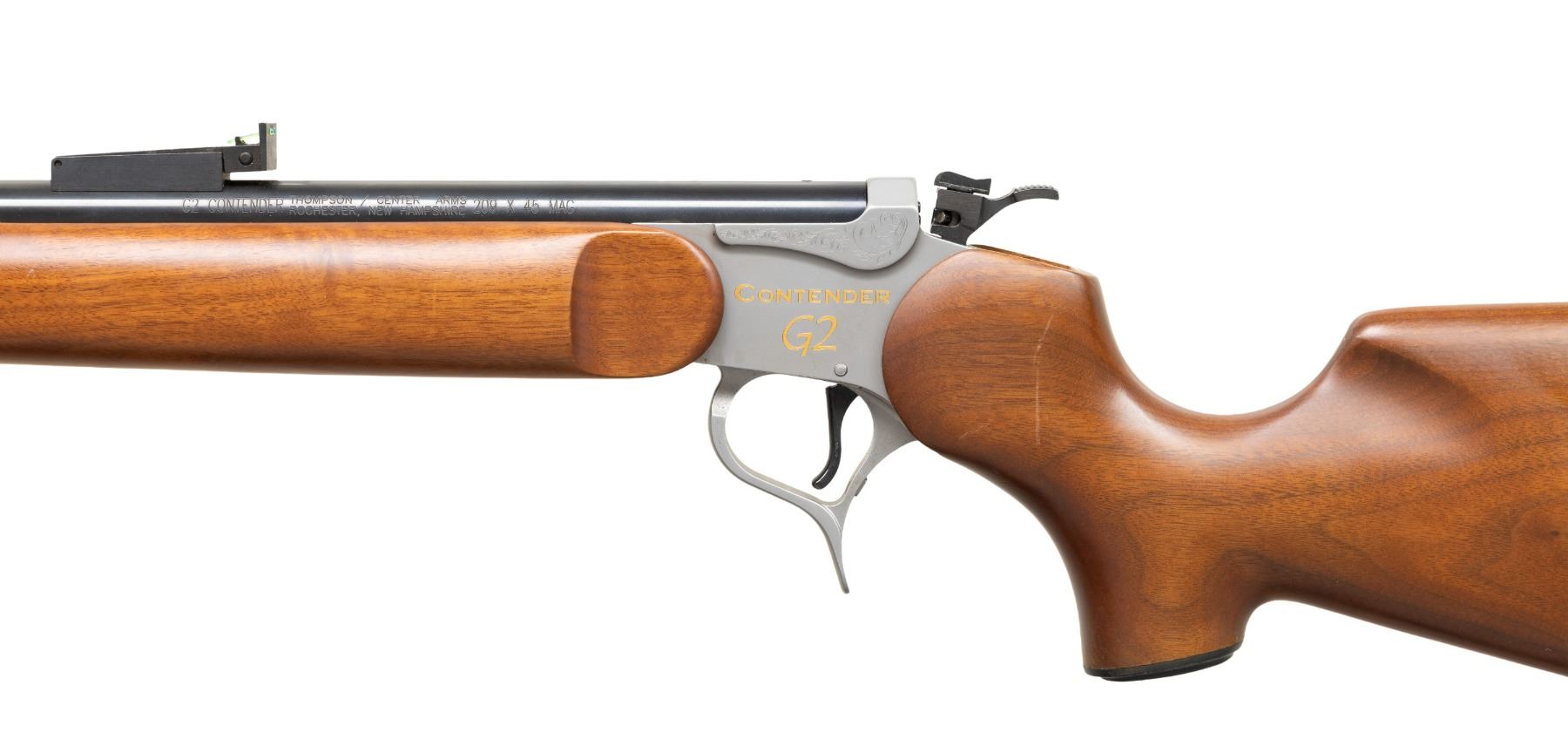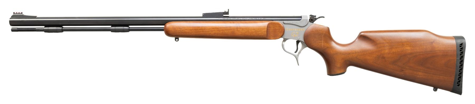 MUZZLELOADING SINGLE SHOT RIFLE. Cal. 209X45 Mag. S# SG40-22. Bbl. 24" muzzle loading designed for 209 primer ignition; screw attached T/C fiber optic adjustable sight set (red front, green rear). Rochester marked plus drilled and tapped (plug screws installed) for scope base at rear of blued barrel that is fitted with thimbles and ramrod. Mfg. 2007 to commemorate 40 years of the Contender; believed limited to 100 units. G2 stainless frame having engraving on the raised reinforced sections along with gold accents; "CONTENDER G2" on left plus medal and banner decoration on right. Smooth, satin finished walnut stock set (Monte Carlo butt) with sling studs, black ventilated T/C recoil pad and black grip cap with intertwined "TC" of silver. Classed as MODERN rather than ANTIQUE due to frame capability of accepting modern cartridge barrels. CONDITION: careful scrutiny will yield very faint marks on stock set; all other aspects near excellent with unfired appearance. PROVENANCE: Estate of Groves Herrick.(25-5740/NW). MODERN. $500-750.