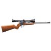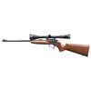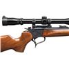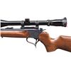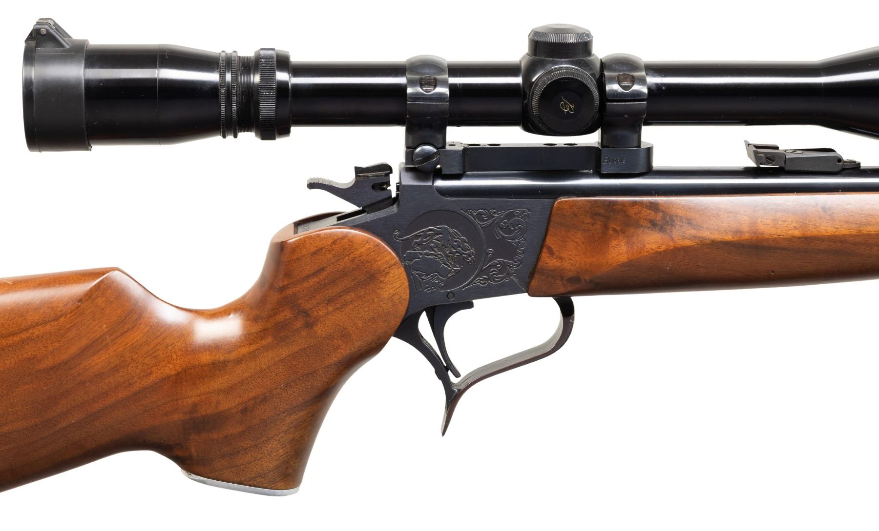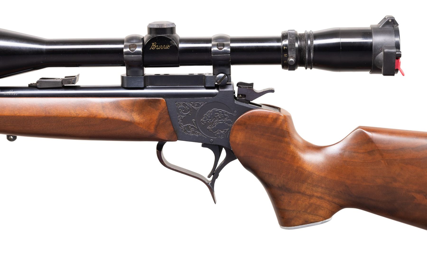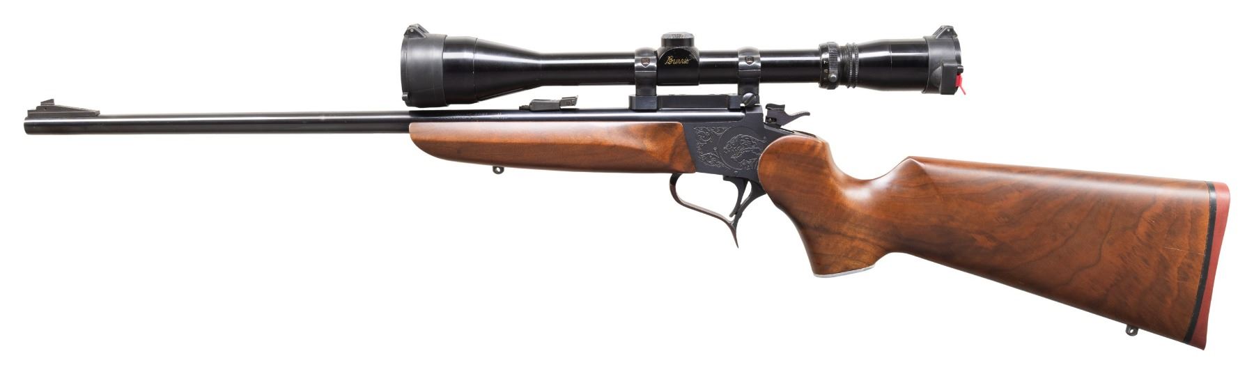 CARBINE. Cal. 22 Hornet. S# 307553. Bbl. 21" Rochester marked with screw attached adjustable sights. Mfg. 1987 as blued Contender with easy open frame plus selector / safety on top of hammer. Redfield steel twist in scope mount set with single top screw 1" rings holding Burris 4-12 gloss finished scope having adjustable objective, duplex reticle and flip up Butler Creek lens caps. Attractive, dark toned stock set with slight figure; detachable sling studs, red TC rubber buttpad plus pewter grip cap having raised puma. CONDITION: plum tone to trigger guard and a couple of very faint handling marks on stock set; balance is near excellent including bore and scope set. (25-5616/NW). MODERN. $500-750.