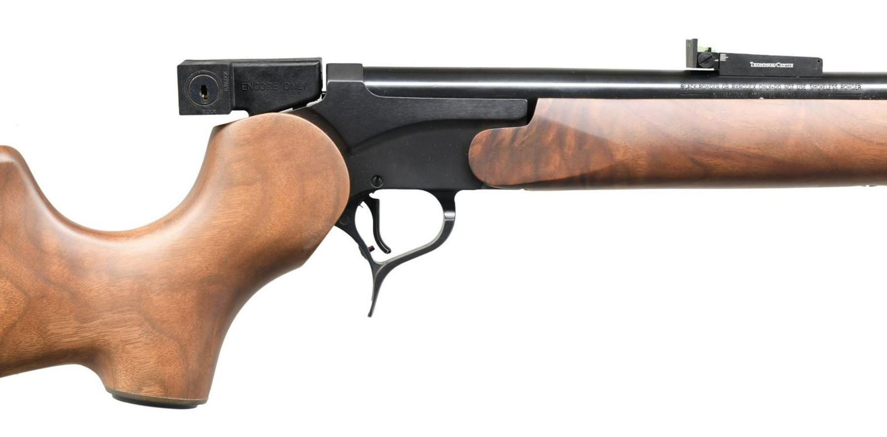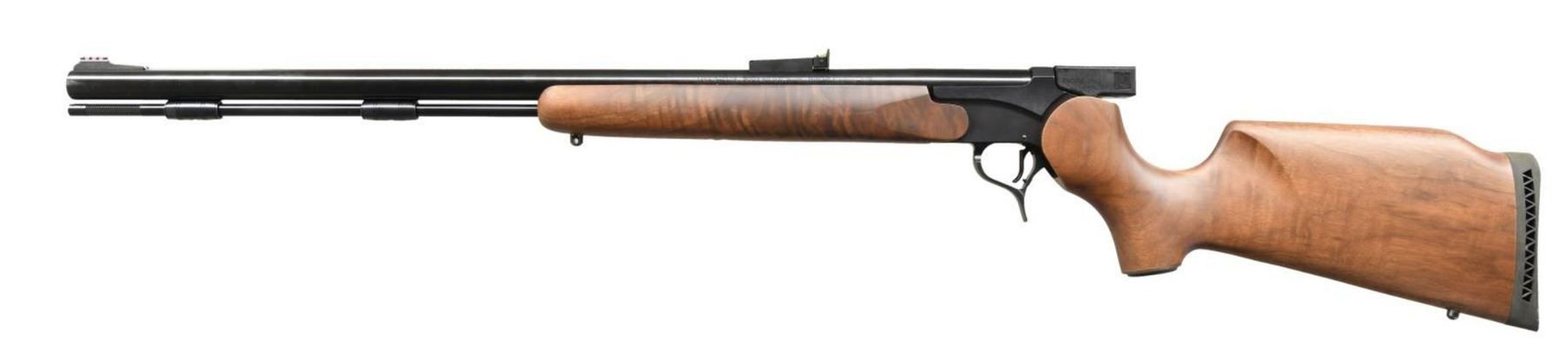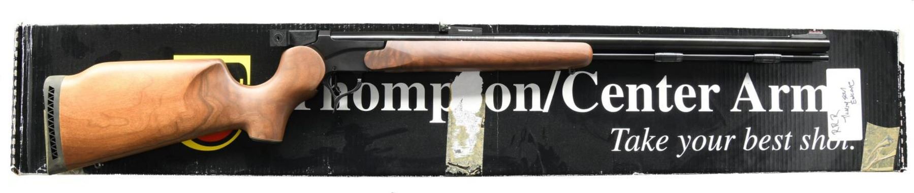 RIFLE WITH BOX. Cal. 50. S# 104077. Bbl 26 1/2". Encore single shot percussion rifle manufactured by Thompson Center Arms. Standard markings on barrel. Blued finish with smooth wood buttstock and forend. Red fiber optic bead front sight with green fiber optic U-notch rear sight. UNATTACHED ACCESSORIES: matching factory box containing its styrofoam insert. CONDITION: excellent, with metal components retaining bountiful amounts of their original factory blue finish overall. Brilliant mirror bore, exhibiting well defined rifling throughout. Wood furniture is excellent overall. Box shows some mild exterior wear, but otherwise remains sturdy and serviceable. (23-2639/MLW). MODERN. $500-750.