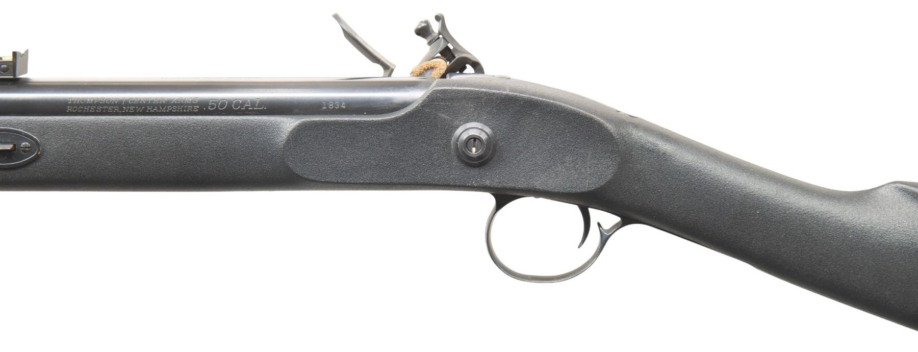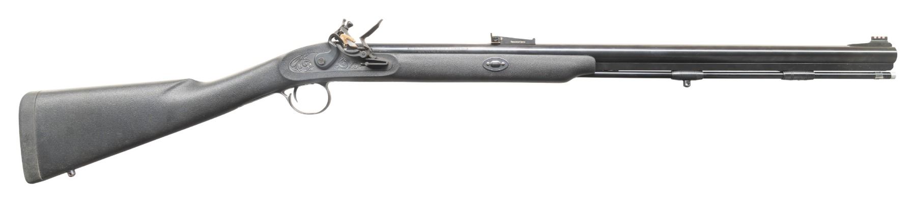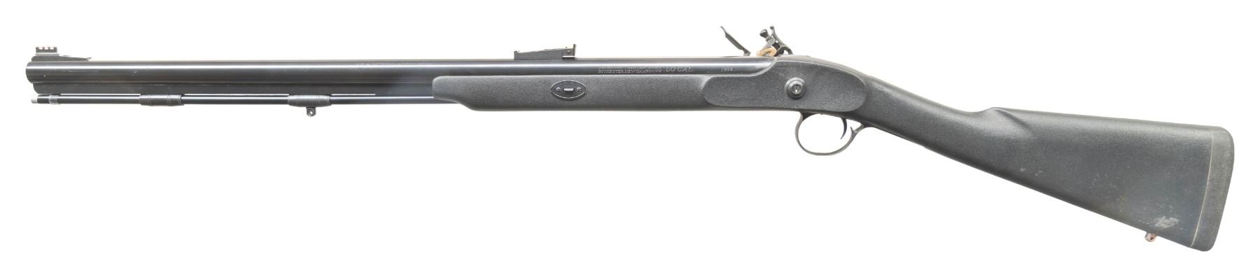Cal. 50. S# 1834. Bbl. 27". Fiber optic sights with adjustable rear. Blued finish. Half-length black synthetic stock with bottom mounted sling studs & factory recoil pad. LOP: 13 1/2". Blued ramrod present. CONDITION: stock shows some mud staining on toeline & handling marks. Metal retains 97% original blue with a couple patches of oxidation at rear of bbl. Action functions properly when hand cycled. Very good bore with some light frosting but strong rifling. PROVENANCE: Estate of Groves Herrick. (01-28361/MJC). ANTIQUE. $100-300.