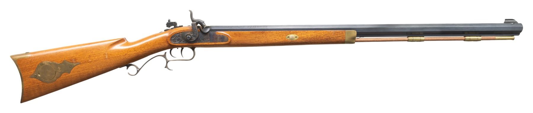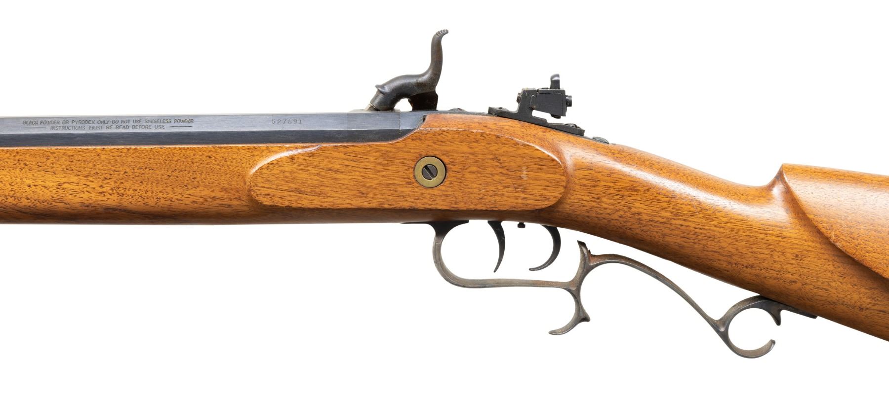 Cal. 45. S# 527691. Bbl. 30". Bead front sight. Tang mounted aperture rear sight. Bbl. Has two screw holes for further sight mounting. Blued bbl. Case colored lock, hammer & trigger guard. Double set triggers. Brass furniture. Half-length walnut stock. Brass tipped hardwood ramrod. CONDITION: stock shows a few spots of finish loss, some light dings & scattered handling marks. Case colored parts retain amounts of case colors with some light oxidation & fading to gray. Brass parts are dulling to yellow with some light oxidation. Blued parts retain nearly all their finish with some scattered light oxidation, edge wear & handling marks. Action functions properly when hand cycled. Bore shows light oxidation but has strong rifling. PROVENANCE: Estate of Groves Herrick. (01-28319/MJC). ANTIQUE. $100-300.