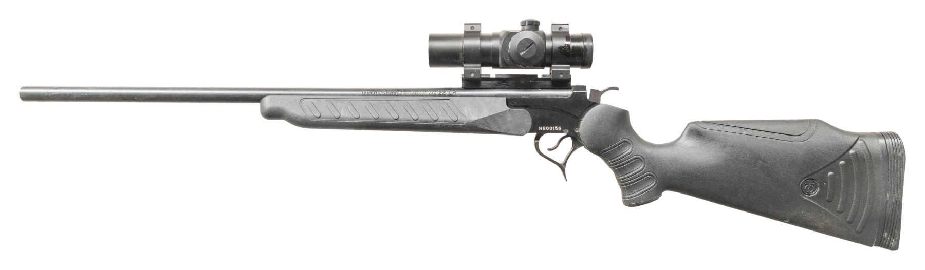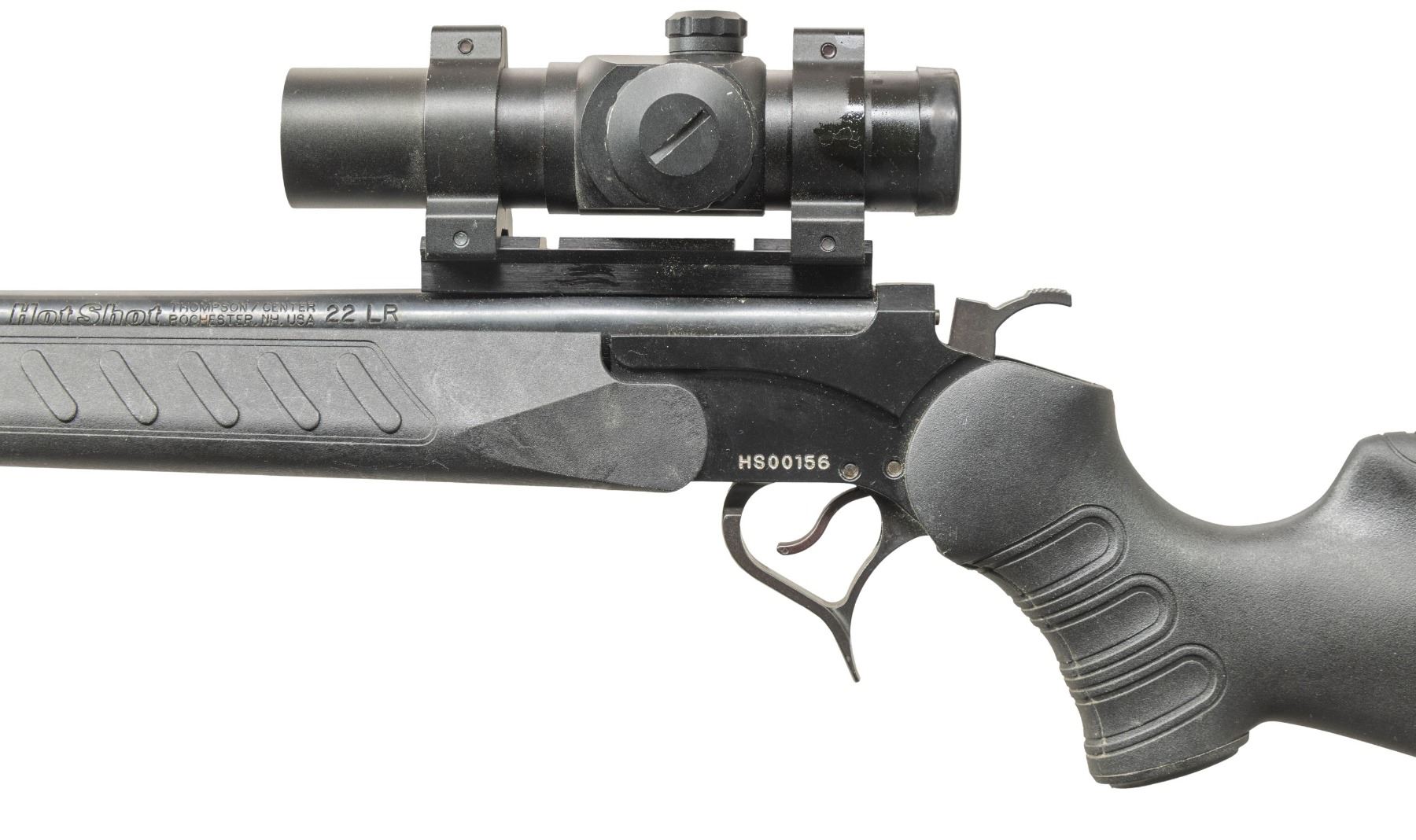 Cal. 22 LR. S# HS00156. Bbl. 19". Rifle is sighted with a Hawke dot sight that still appears functional. Front sight hole is vacant. First Edition One of 1000 Hot Shot rifles. Blued & anodized finishes. Black synthetic stock set. CONDITION: stock set shows some scuffing, handling marks & dirt staining. Metal retains 90% original finishes with scattered oxidation along bbl. & some handling marks. Action functions properly when hand cycled. Bright near excellent bore. PROVENANCE: Estate of Groves Herrick. (25-5751/MJC). MODERN. $200-300.