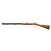 RIFLE. Cal. 50. S# 20755. Primitive weapon season in Pennsylvania is limited to flintlock rifles. Thompson Center answered the call. This 1/2 stock rifle has 32" 1/2 rnd., 1/2 octagon bbl. w/ underrib fitted w/ adj. rear & steel bead front sights. Maker’s info, etc. is on upper left & right flats toward rear. Case hardened flintlock has cast in scroll engraving. Walnut stock measures 13 3/4" over cast aluminum buttplate marked “TC”. Hardwood ramrod w/ steel tip mounts through 2 turned pipes & hole in front of stock. CONDITION: very fine, retaining nearly all factory finishes. Bright shiny bore is relieved for 2" at muzzle. Mechanically fine. (01-21180/MGM). ANTIQUE. $400-600.
