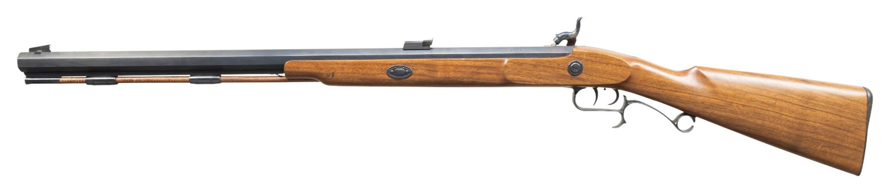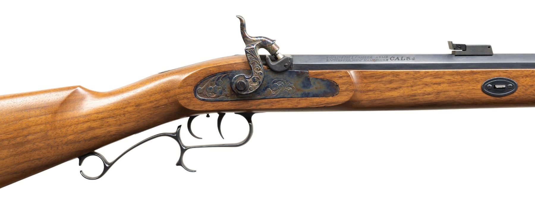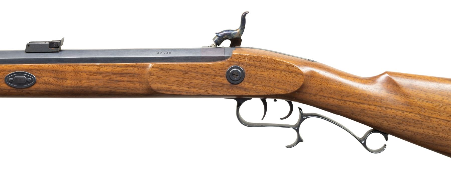 Cal. 54. S# 42508. Bbl. 27" oct. Blade front sight with added white paint. Adjustable rear sight. Double sight triggers. Case colored lock assembly. Brass furniture. Balance of other parts are blued. Half-length walnut stock. TC buttplate present that displays a poor fit. Hardwood ramrod with iron tip. CONDITION: stock shows some dings & handling marks. Lock retains nearly all their case colors with some light fading. Blued parts retain 97% finish with some handling marks, light oxidation & edge wear. Action functions properly when hand cycled. Very good plus bore with strong rifling. PROVENANCE: Estate of Groves Herrick. (01-28378/MJC). ANTIQUE. $100-300.