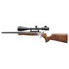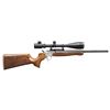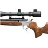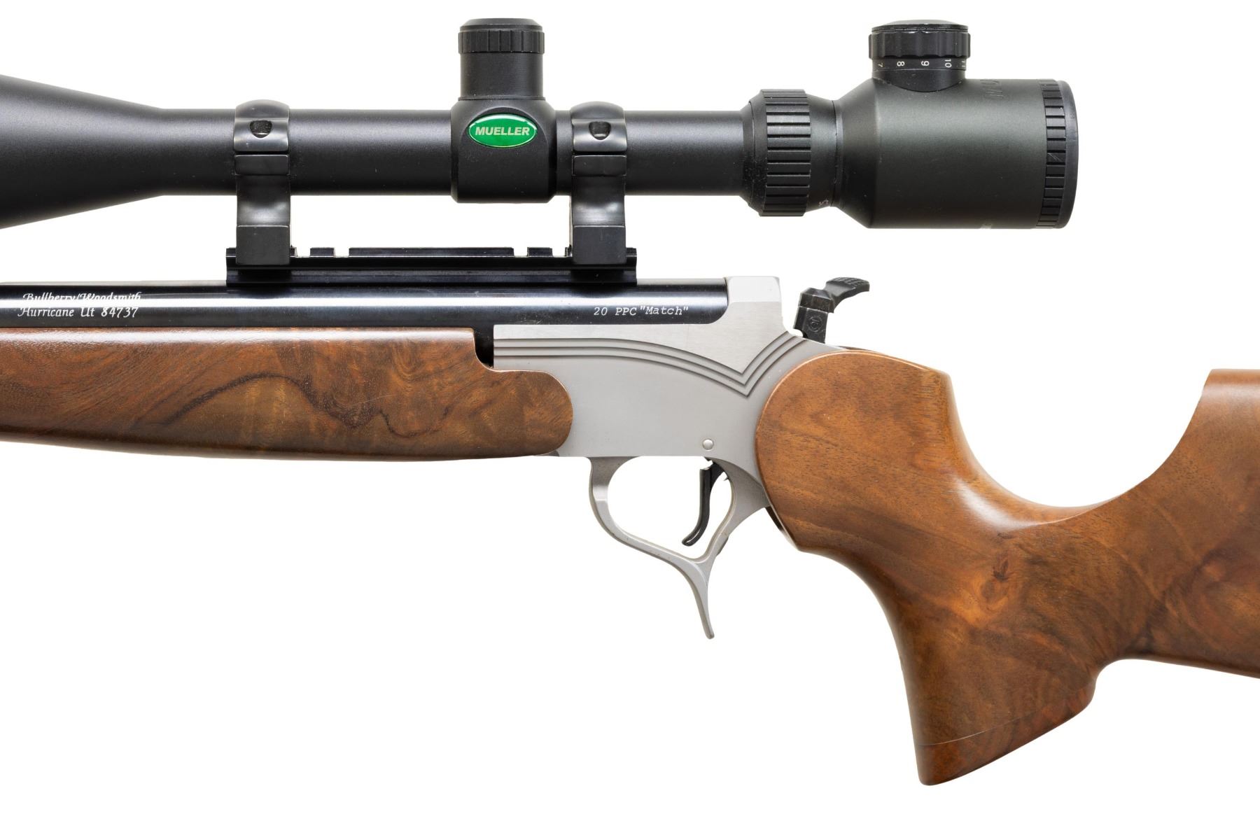 CARBINE. Cal. 20 PPC Match. S# 533195. Bbl. heavy tapered Bullberry / Woodsmith with recessed target crown, Weaver base and contoured Redfield style steel rings having double top screw tops. Mueller Eradicator 8.5-25X50 Adjustable Objective matte finished scope with fine crosswires leaving space at center for its variably illuminated red dot. Grip leg of its stainless frame has Rochester marking. Sides of receiver are mostly matte with the top reinforcing section having stepped polished sides. Satin finished walnut stock set with Pachmayr solid brown recoil pad; forend has schnable style tip. Cartridge is based on Russian 220 casing; known for its accuracy and high velocity (about 4,000 FPS) using bullets of 32-40 grains. CONDITION: some faint spots of pinprick oxidation on forward half of barrel; all other aspects near excellent including bore and scope set. PROVENANCE: Estate of Groves Herrick. (25-5748/NW). MODERN. $500-750.