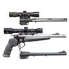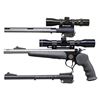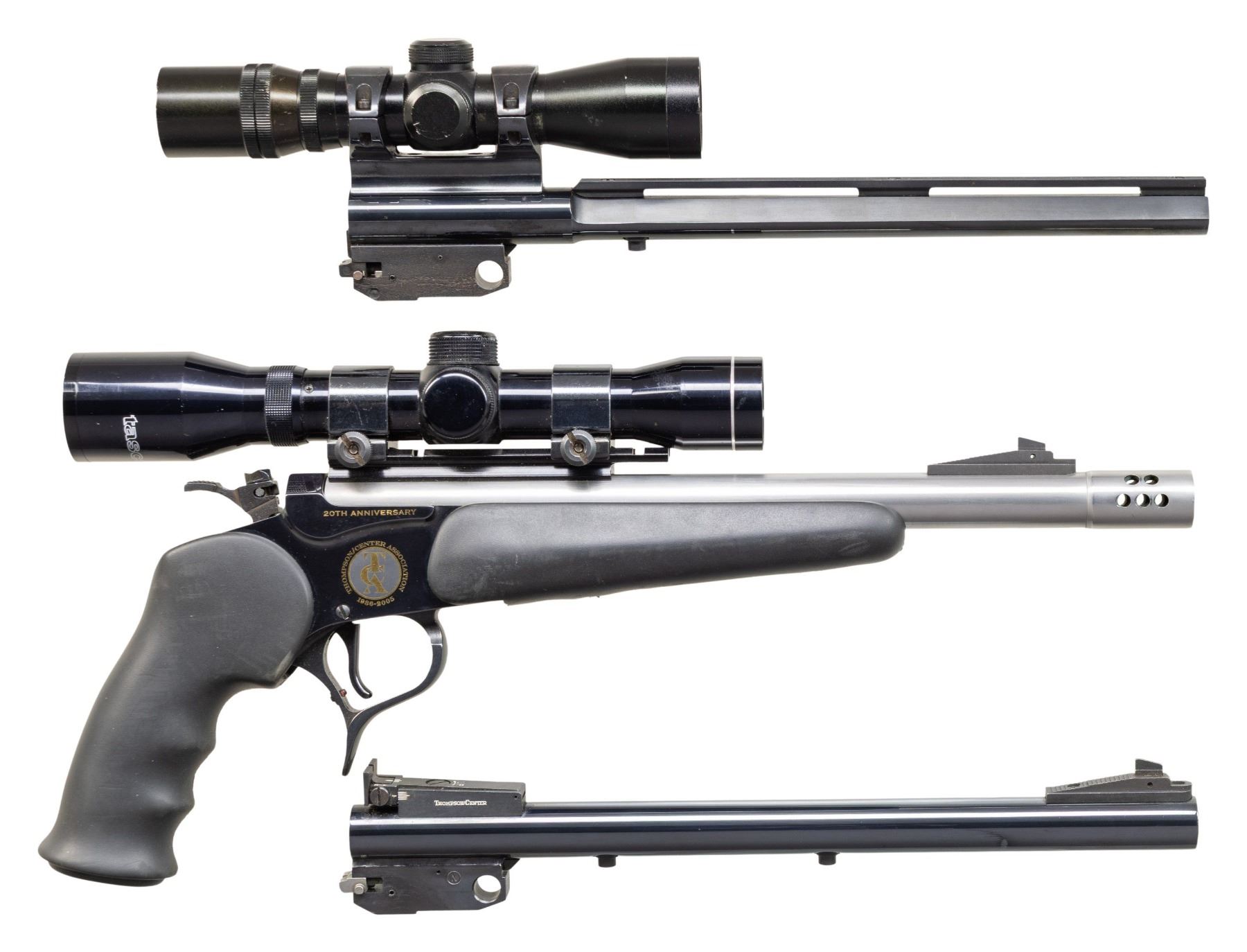 PISTOL WITH TWO SPARE BBLS.Cal. 7-30 Waters. S# TCA 20-022. Bbl. 12" stainless with muzzle brake. Blade front sight. No rear iron sight. Pistol is equipped with Tasco 4x28 scope. Scope has duplex crosshair reticle & good optics. 20th anniversary Contender pistol made in 2005. Frame has blued finish with gold accents. Black rubber finger groove grip & forend. UNATTACHED ACCESSORIES: matching numbered factory box with manual, 7-30 Waters carbine kit that is empty & numbered to a different gun, two empty 7-30 carbine bbl. boxes, 12" 25-20 bbl. with iron sights & 12" 270 Rem bbl. with VR & 4x28 duplex crosshair reticle scope that appears to lack a maker's marking. CONDITION: furniture shows some scuffing & scattered handling marks. Bbl. shows some minor handling marks & a couple specks of light oxidation. Frame retains nearly all its original bluing with some minor handling wear. Action functions properly when hand cycled. Bright near excellent bore. Spare bbls. have near excellent bluing & bores. PROVENANCE: Estate of Groves Herrick. (25-5652/MJC). MODERN. $400-600.