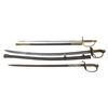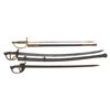1) Unmarked heavy cavalry saber, 35" blade, iron scabbard, grip leather missing, but sprung wire present. 2) Ames 1864 dated & inspected model 1840 Musician's sword, 28" bright polished blade, inspected brass mounted leather scabbard. 3) Clauberg 1850 staff officer sword, dark pitted 30.5" blade, spiral carved wood grip, fragment of twisted wire, paint spattered. CONDITION: good overall as described. (02-25637/JS). NON-GUN. $600-800.