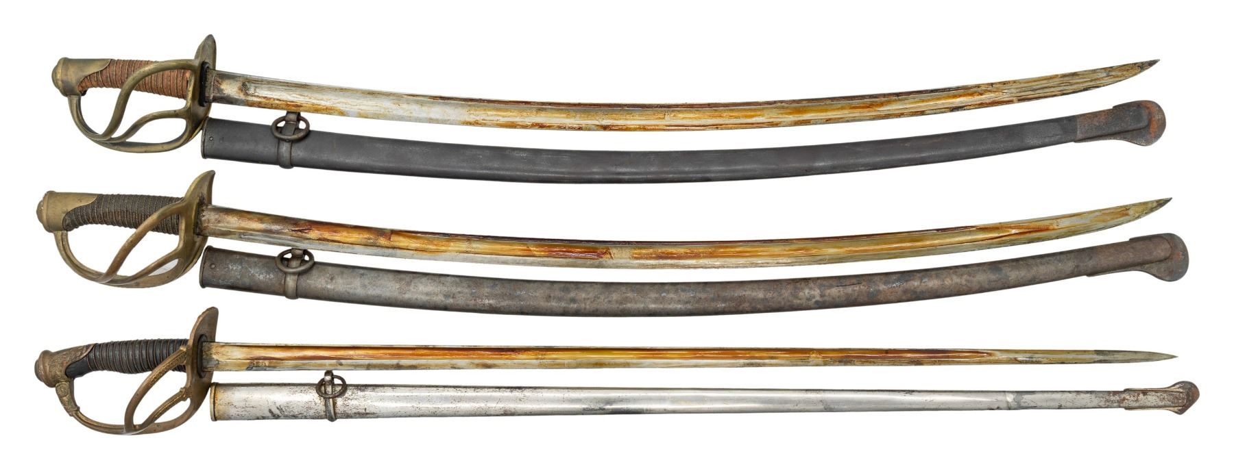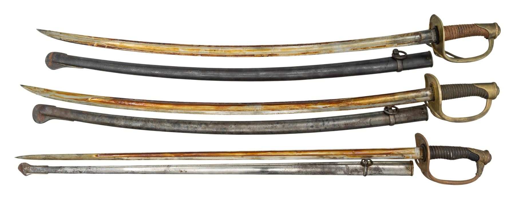 Each saber has 36" blade, one officer saber with decorated hilt & polished horn grip with twisted wire wrap. Other 2 sabers have French makers marks & proofs. Each has well fit steel scabbard with single ring mounts. CONDITION: very good overall, all 3 sabers have heavy grease protective coatings on bright blades. (02-25636/JS). NON-GUN. $600-1,200.