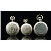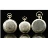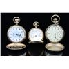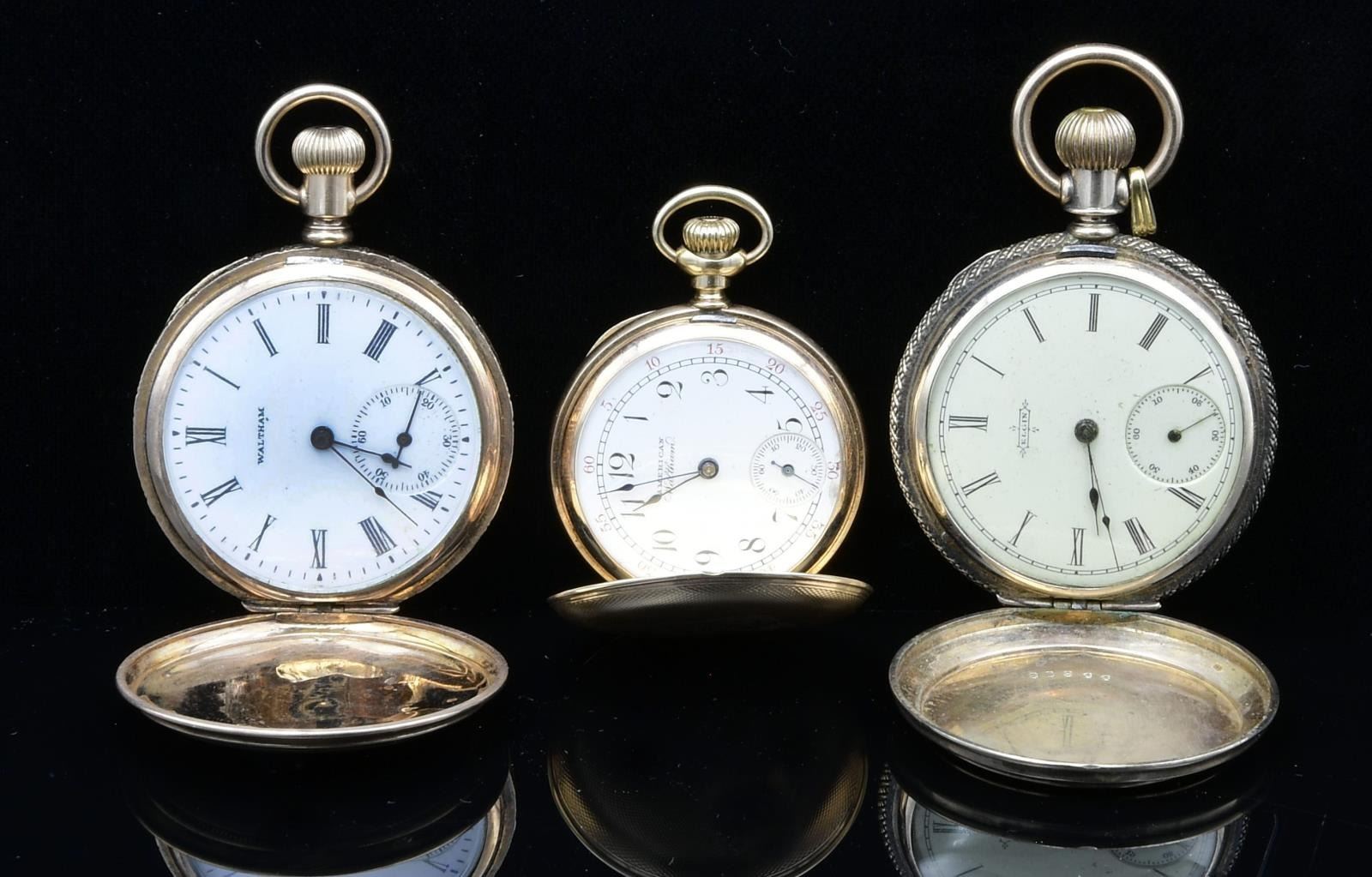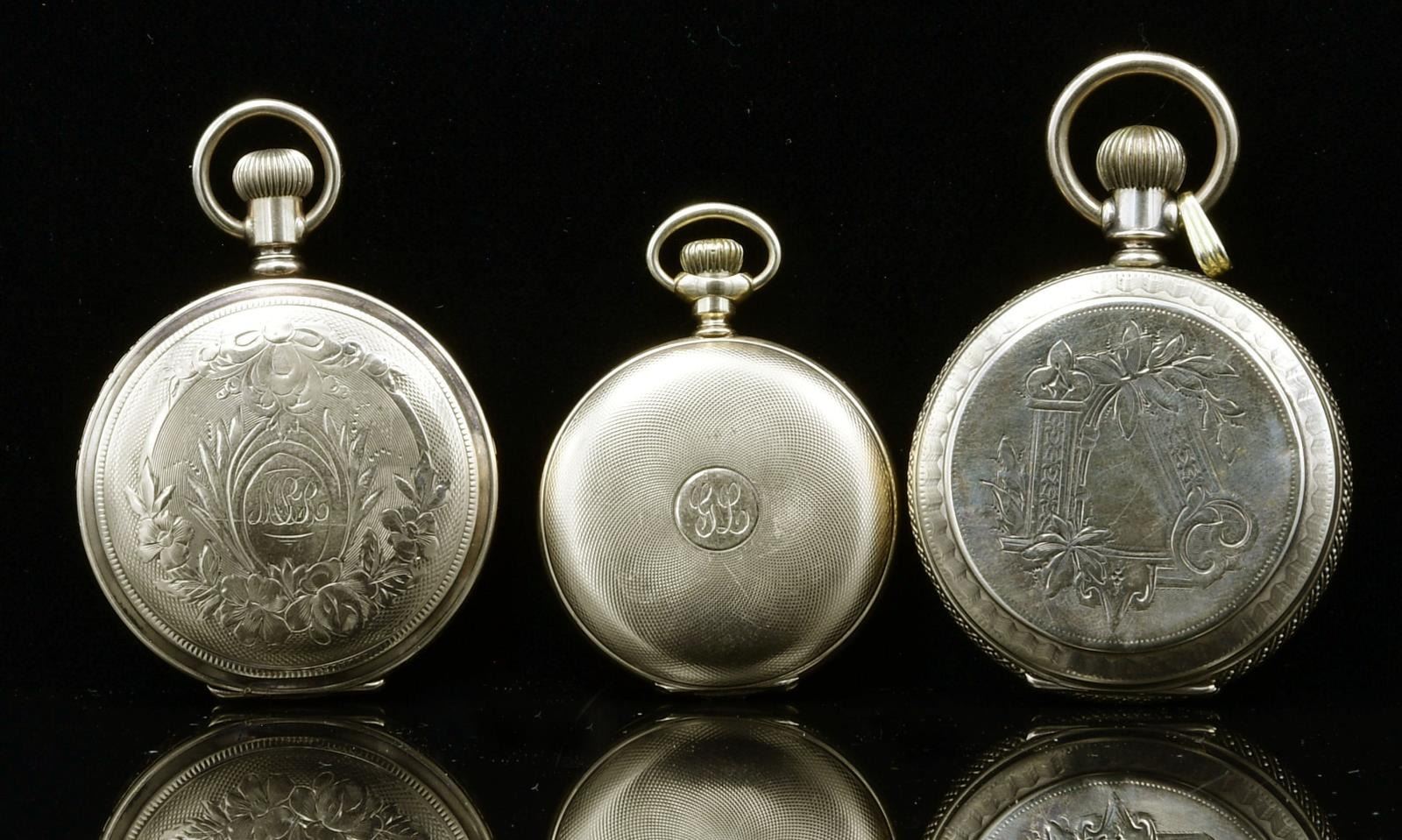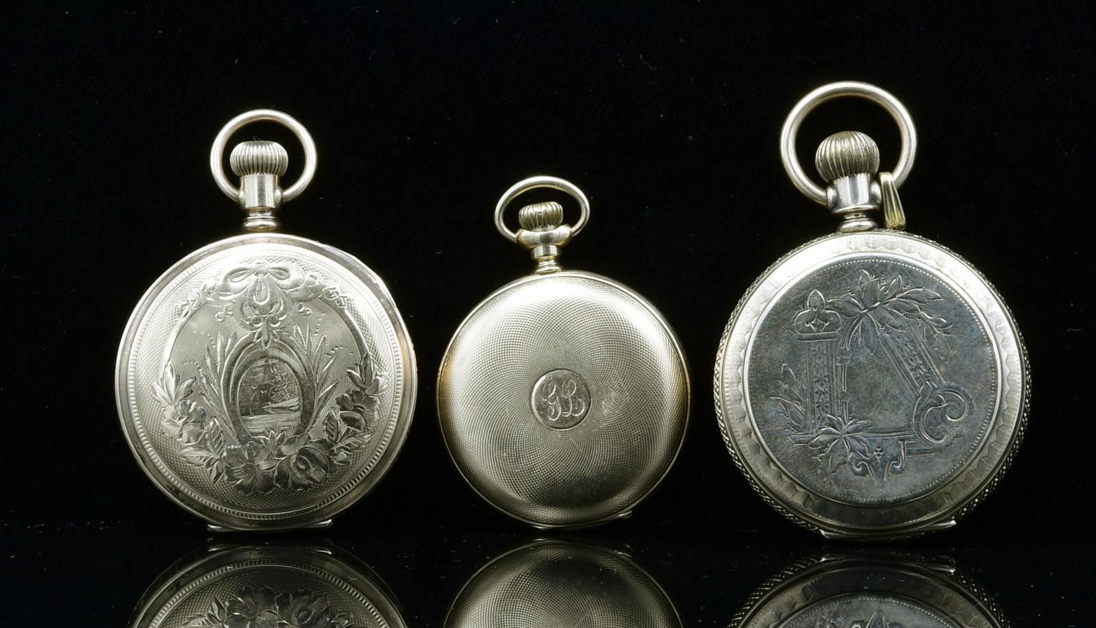 WATCHES. 1) Dial marked "Waltham", case marked "C.W. Mfg. Co. Standard American Assay". Works marked "American Waltham Watch Company, SN 9158560". Front and back covers nicely engraved, reverse with a small sketching depicting landscape, the front with conjoined initials and foliate design. CONDITION: generally good, watch runs. 2) Dial marked "American Waltham". Case marked "14kt", works marked "A.W. W. Co., Lady Waltham, S 6521073". Exterior of case with engine turned design. Initialed "GL". CONDITION: case shows some wear, watch runs. 3) Dial marked "Elgin". Exterior of lids engraved, the back lid with sketching depicting a church. CONDITION: case generally good, watch does not run. (05-673-4/JJ). $800-1,000.