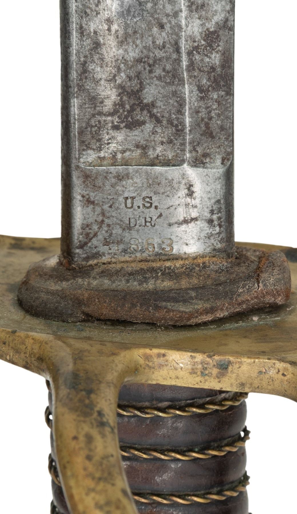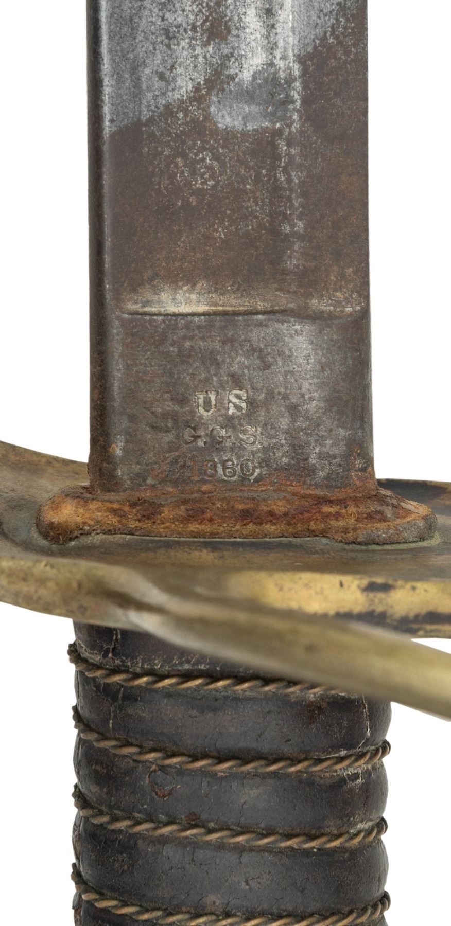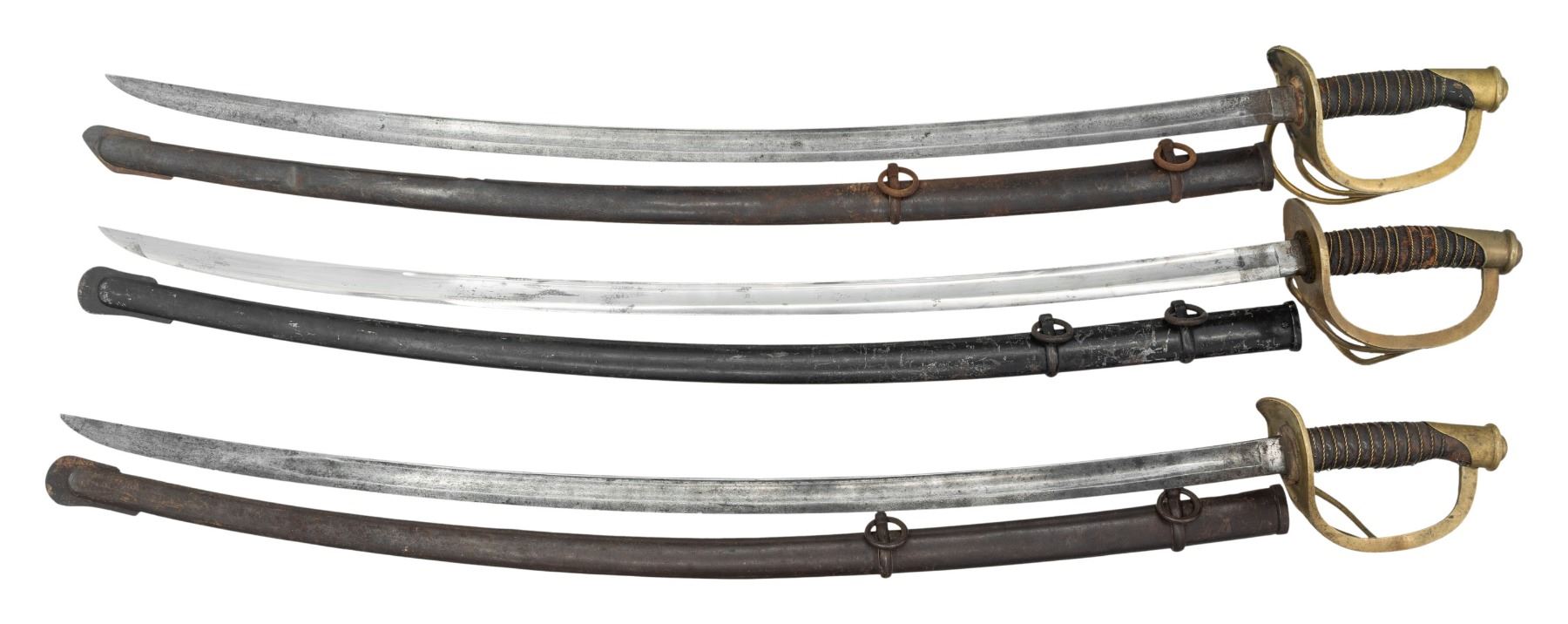 1) VERY SCARCE 1860 DATED AMES model 1860 cavalry saber, 35" blade crisply maker marked, dated & inspected, complete leather & wire grip, well fit scabbard. 2) 1863 dated & inspected Ames cavalry saber, 35" blade, complete leather & twisted wire wrapped grip, well fit rusted scabbard, worn drag. 3) 1865 dated Roby cavalry saber, 35" bright blade, well fit 1906 scabbard, chipped leather & complete twisted wire grip. CONDITION: very good overall. (02-25635/JS). NON-GUN. $800-1,200.