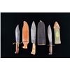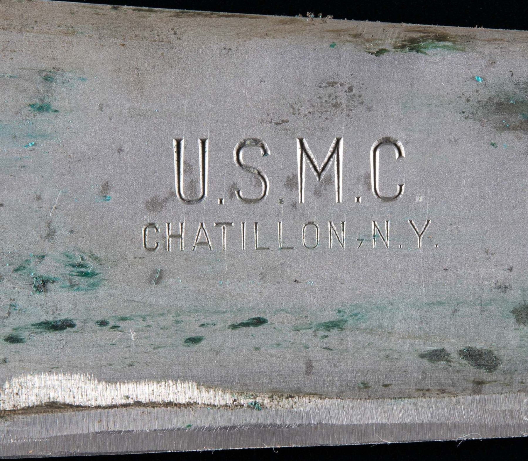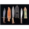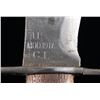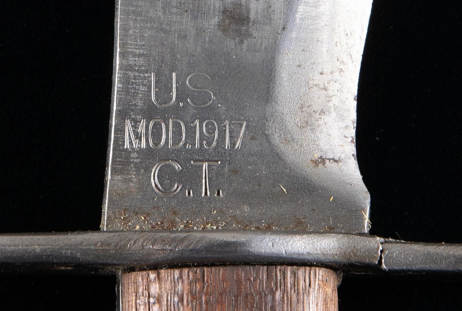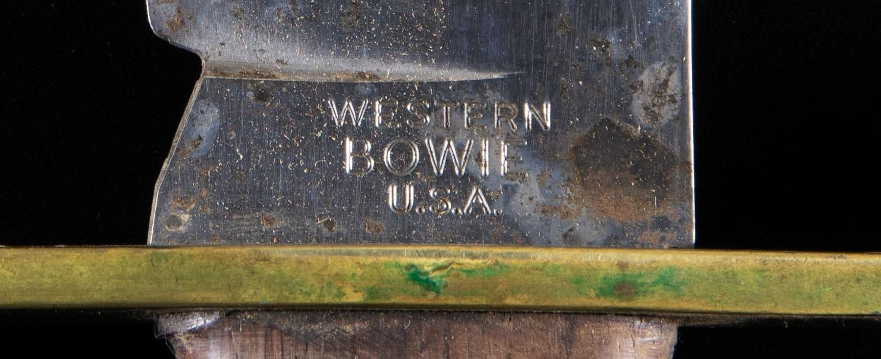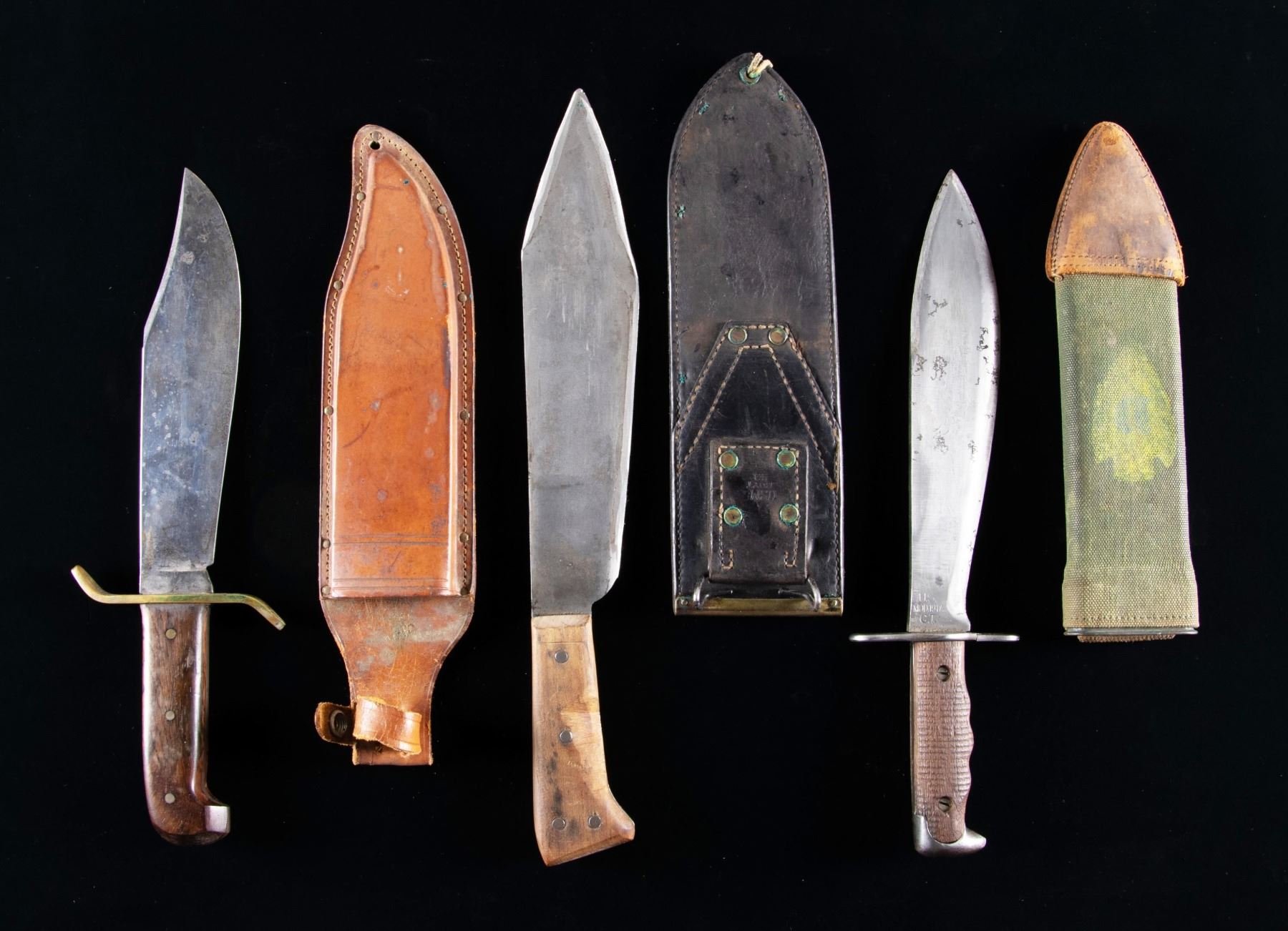 1) Western Special Forced Bowie. Blade measures 9 1/4". 14 5/8" overall. Bright bowie blade is marked on right ricasso "WESTERN / BOWIE / U.S.A.". Brass crossguard swept forward at the top & rearward at the bottom. Rosewood grips secured by three rivets. Brown leather sheath. Sheath w/ riveted & stitched construction is unmarked. Plain belt loop. Retaining strap is present. CONDITION: blade has been lightly sharpened w/ light wear & scattered spots of oxidation as well as discoloration throughout. Crossguard is a pleasing patina w/ a small amount of verdigris. Rosewood grips have light wear & scratches. Leather sheath has wear, handling marks & spots of staining. Stitching is tight. 2) Model 1917 C.T. Bolo. 10 1/8" blade. 14 7/8" overall. Blade is marked on left ricasso "A.C. CO. / CHICAGO / 1918". Right ricasso is marked "U.S. MOD. 1917 / CT". Straight crossguard marked only w/ tiny "flaming bomb". Coarse machined replacement black walnut grips. Green canvas covered scabbard w/ brown leather tip equipped w/ Model 1910 belt hook. Brown leather tip is marked "BRAUER BROS / 1918". Scabbard is marked w/ a faded yellow inverted arrowhead enclosing a "D". CONDITION: blade has been cleaned, is returning to gray w/ wear & scattered tool marks throughout. Crossguard has welded repair at bottom. Replacement grips show very light wear. Scabbard has moderate wear & light scuffing w/ some loss of stitching. 3) U.S.M.C. Medical Corpsman 1st Issue Knife. 11 3/8" bright blade. 16 3/4" overall. Blade is marked on left side "U.S.M.C. / CHATILION, N.Y.". Hardwood grips secured by four rivets. Brown leather scabbard. Brass throat is the early type secured by two rivets. Scabbard is marked on back "USMC / BOYT / 43". CONDITION: blade has been heavily modified by grinding to shape the rounded tip into a point. Grips have been modified by the addition of finger grooves. Modifications show hobbyist workshop quality. Scabbard has dark stained leather w/ numerous handling marks. Stitching remains tight. (02-24537-7/RW). NON-GUN. $600-900.