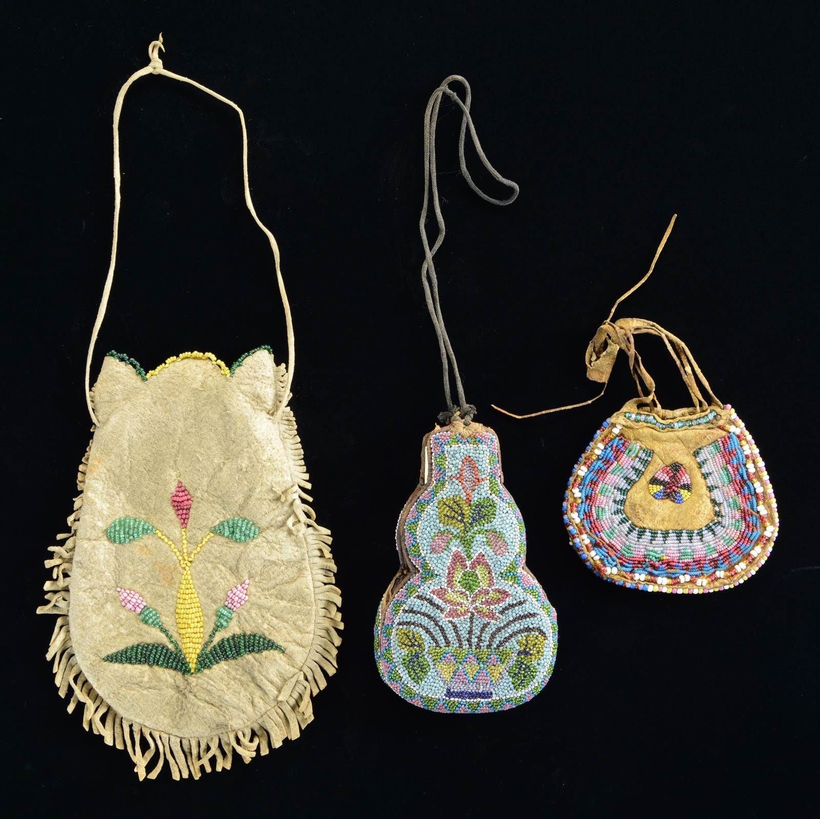 2 petite 4.5" & 3" purses, both finely decorated with diverse palette of colored beads, both double sided with different intricate designs. The 3rd pouch is deerskin with simplistic design. This group is very unique, especially the 2 petite purses. UNATTACHED ACCESSORIES: Descriptive sheets on two petite purses. CONDITION: good overall, all thread sewn with intact designs, minor losses. PROVENANCE: Martin Lane Historic & Western Americana Lifetime Collection. (02-21448/JS). $600-800.