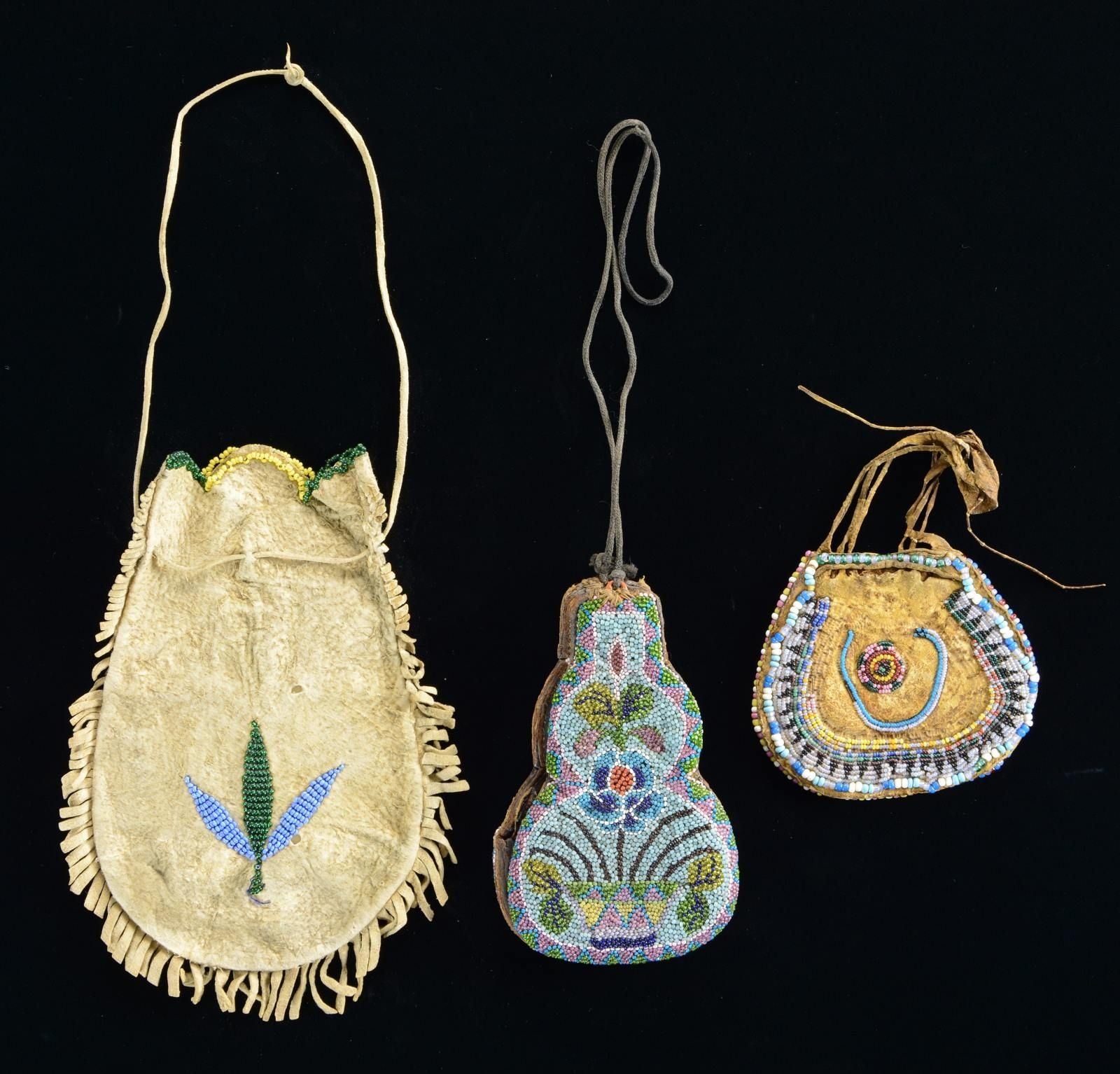 THREE NATIVE AMERICAN BEAD DECORATED POUCHES.