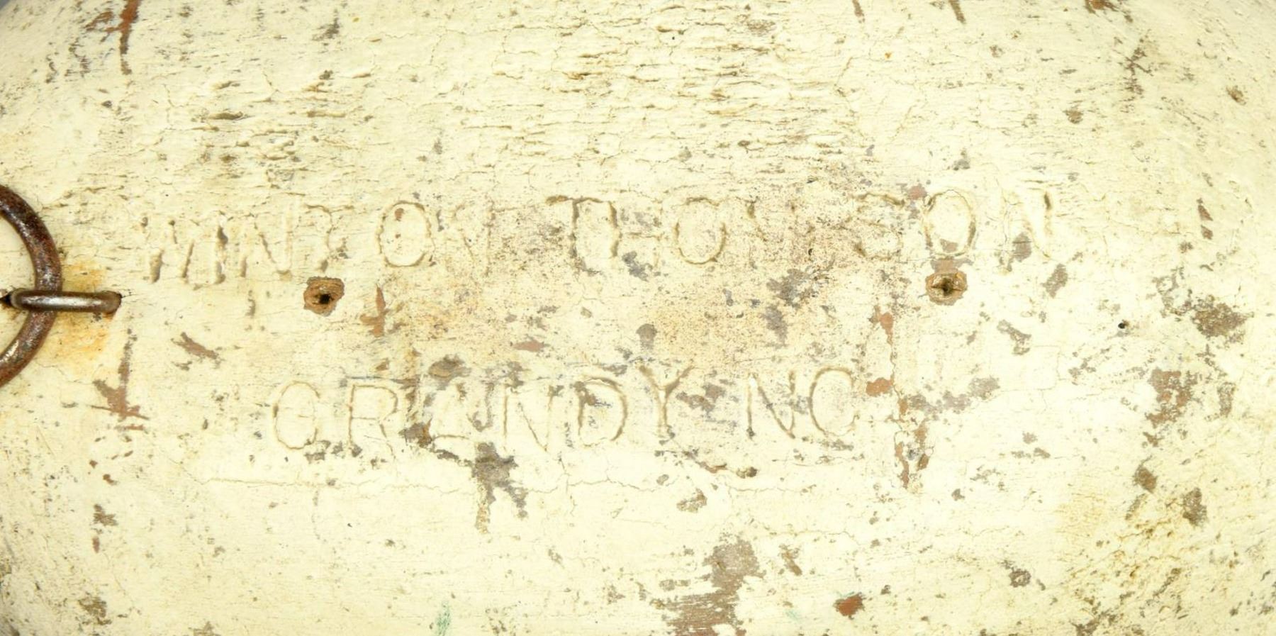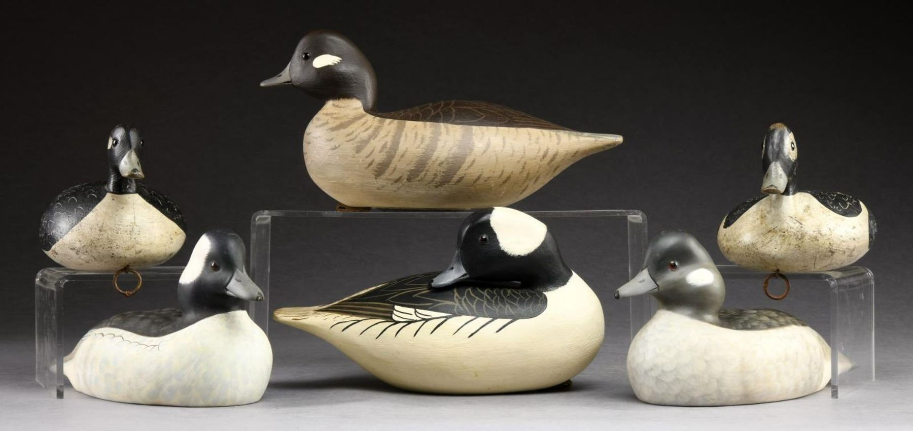 Late 19th, early 20th century. 1) Small pair with brown glass eyes, stamped "WH Thompson/Grandy NC". SIZE: 8" and 9". 2) Drake and hen with brown glass eyes, marked "Paul & Mary Leigh Crumpler, Colonial Heights, VA 2003" and stamped "P.M.C.". SIZE: 10 1/2". 3) Two decoys by Clarence Fennimore, signed "C. Fennimore" in pencil on the underside of each. Both weighted examples with brown glass eyes. One duck posed preening its feathers. SIZE: 12 1/2" and 11". PROVENANCE: Estate collection of Thomas F. Wolfinger. CONDITION: all structurally sound and intact with good paint overall. Good to very good. (02-18016/TG). $200-400.