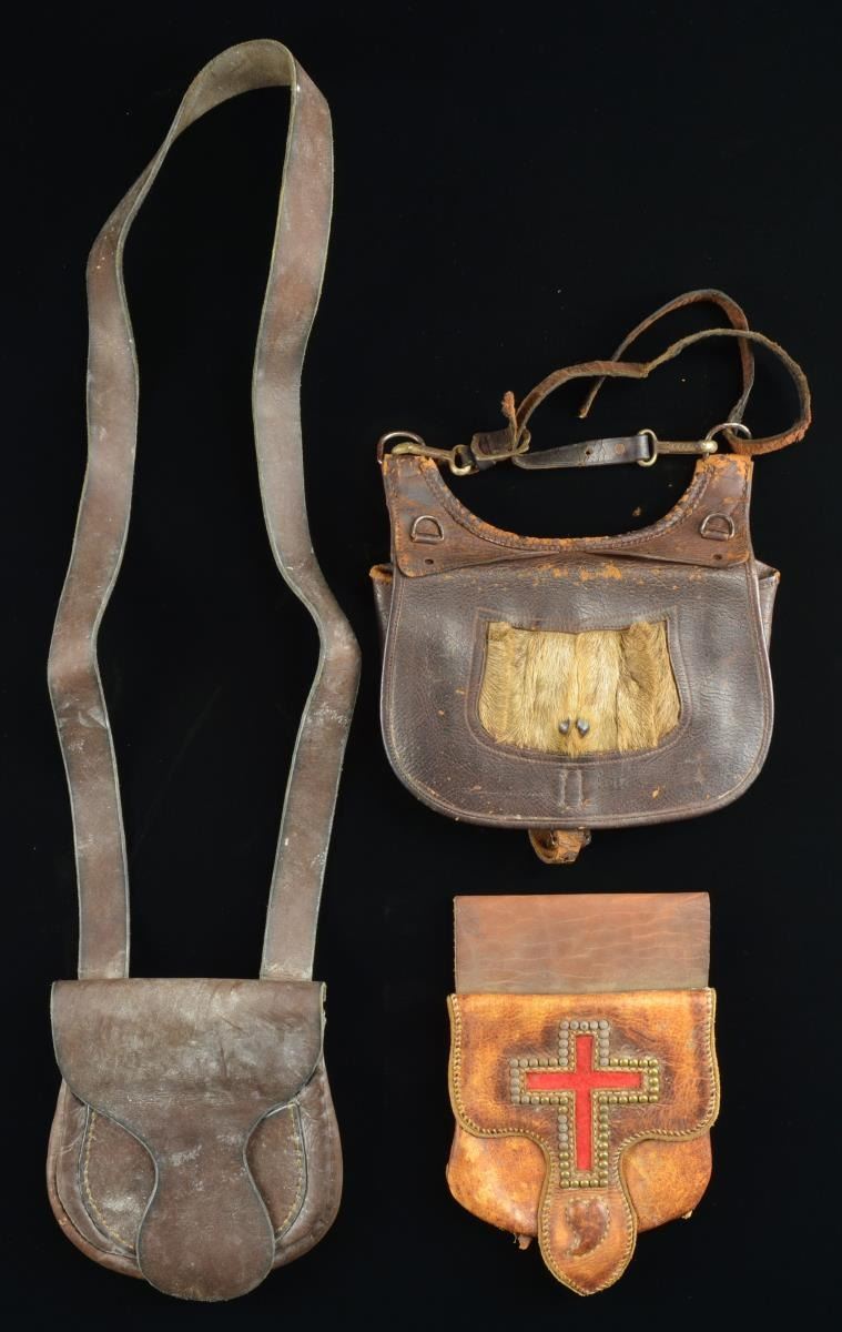 1. 10x8” Outer flap with decorated animal skin and horn, inner pouch has band for shells, lined in brown canvas, small flapped pouch. Pouches fair to good overall, the over the shoulder sling leather is broken and shortened.