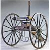 Cal. 45-70. S# 11782-0001. Bbls. 31.75" An iconic Gatling gun repro from Thunder Valley based on the original Colt 1872 variant. The familiar 10 bbl. cluster in the iconic brass receiver is augmented w/ steel receiver rails & mounted on an attractive wooden carriage. Carriage wheels w/ wooden spokes & steel banded, measure a whopping 53" in height. Green spokes & wheels w/ dark stained wood construction. The pedestal height when mounted is 36" off the ground. Carriage is 8' long from wheel to hitch. This particular model utilizes a Bruce feed mechanism. This gun, like the early originals employs an interesting oscillating traversing mechanism which causes the gun to gently sweep the impact area, maximizing hit potential. The intended target area is adj. by a few degrees & the elevation mechanism is micro adj. by the operator. The top of the brass receiver has affixed a brass nameplate bearing original style markings including “GATLING’S BATTERY GUN” above block of patent dates & below “MADE BY COLT’S PT. FIRE ARMS MFG CO HARTFORD, CONN. U.S.A.”. Left side of brass receiver has a sm. inlet marked “SERIAL NUMBER 11782-0001”. Right side of brass receiver has milled flat surface bearing the following: “MANUFACTURED BY / THUNDER VALLEY MACHINE COMPANY INC. / P.O. BOX 192, 7700. S. SIXTH AVE. / CLINTON, OHIO 44216 U.S.A.” Steel receiver rail on right side also marked w/ S# & triangle proof mark, indicating Suchka manufacture. Elevation adj. rear sight post & coinciding front blade are mounted on the right side of the mechanism so as not to interfere w/ any feed device. This unique Gatling variant had an unusually slow cyclic rate, even for guns of this nature, firing 1 rd. approx.. every 3/4 turn of the crank (slightly faster than a 1:1 ratio). An interesting feature of this model is a lockout/safety device which deactivates the firing mechanism when used for static display. MAGS: 1 Bruce feed mechanism. UNATTACHED ACCESSORIES: steel tripod that can be utilized for firing in place of the carriage mount. Correctly scaled, 32" legs offer the pedestal height a full 28" of ground clearance & each leg is terminated w/ a large 7.5" diameter integral pad for soft ground stability. CONDITION: exposed brass surfaces enjoy a time honored deep rich mustard patina which could be effortlessly polished to a high luster if desired. Exposed metal surfaced painted black. Bores appear very lightly used w/ strong rifling, though having spent most of its time in a static display has earned a gentle patina, but remains clean. The fire control mechanism appears to function correctly & effortlessly when cycled by hand. (20-464/JZ). MODERN. $17,000-20,000.