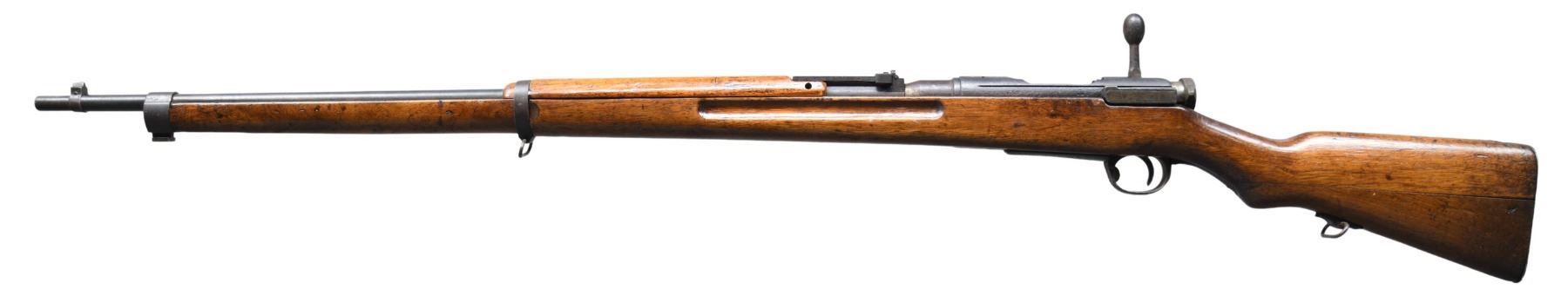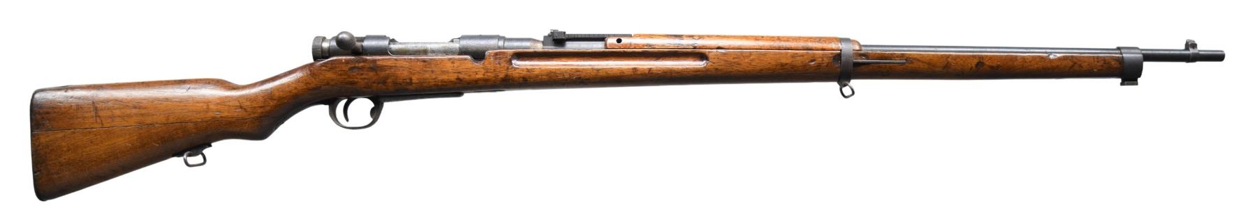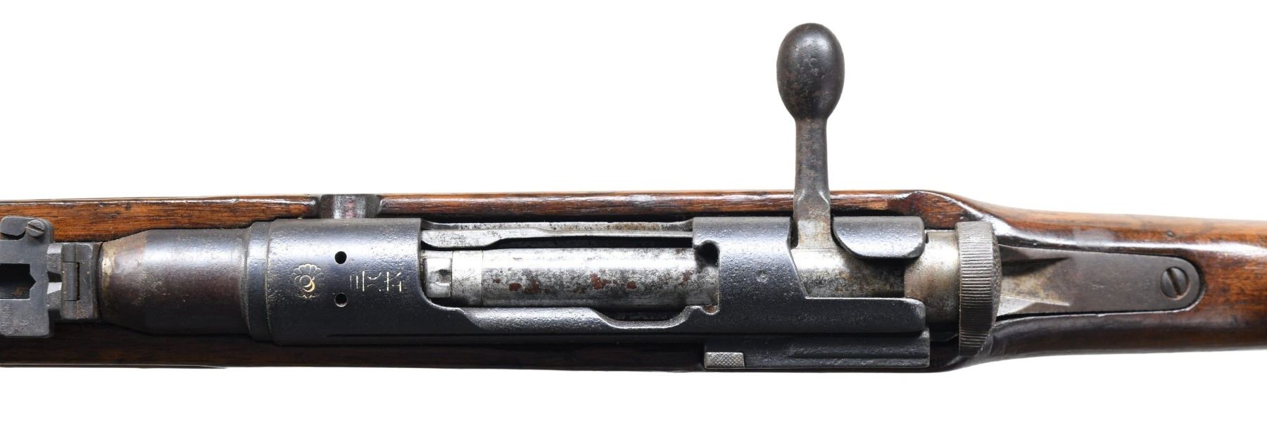 Cal. 6.5 Jap. S# 413593. Bbl. 31". Blade front sight. Ladder rear sight graduated to 2400m. Mismatched assembly numbers throughout. Receiver top has mum over stamped with Tokyo arsenal symbol & Type 38 markings. Left side of receiver has Tokyo arsenal symbol & serial number. Reblued finish. Asian hardwood stock set with bottom mounted sling swivels & two piece butt. Lower tang & front rear sling swivel screws both missing. No cleaning rod present. CONDITION: stock has added varnish with a couple handguard cracks, scattered dings, handling marks & scratches. Reblued metal is turning gray with scattered blued over pitting most notable on receiver, some edge wear & scattered oxidation. Action functions properly when hand cycled. Dark bore with oxidation & pitting but visible rifling. (25-2578/MJC). CURIO. $300-400.