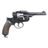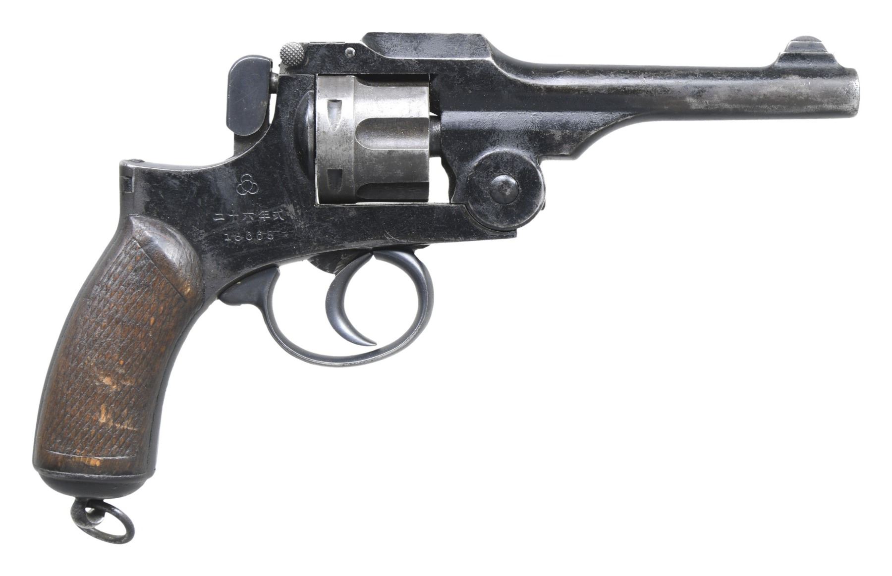 Cal. 9mm Jap Revolver. S# 18668. Bbl. 4 3/4". Blade front sight. Fixed rear sight. Right rear of frame has Tokyo arsenal marking with serial number. Metal has black paint over blued finish. Checkered hardwood grips. Lanyard ring present on bottom of grip frame. UNATTACHED ACCESSORIES: unmarked green holster. CONDITION: grips show dings, chipped checkering & handling wear. Metal shows scattered flaking black paint, edge wear, some pitting, fading to gray & oxidation. Action appears functional when hand cycled. Good bright bore with some light frosting. (25-3741/MJC). CURIO. $300-500.