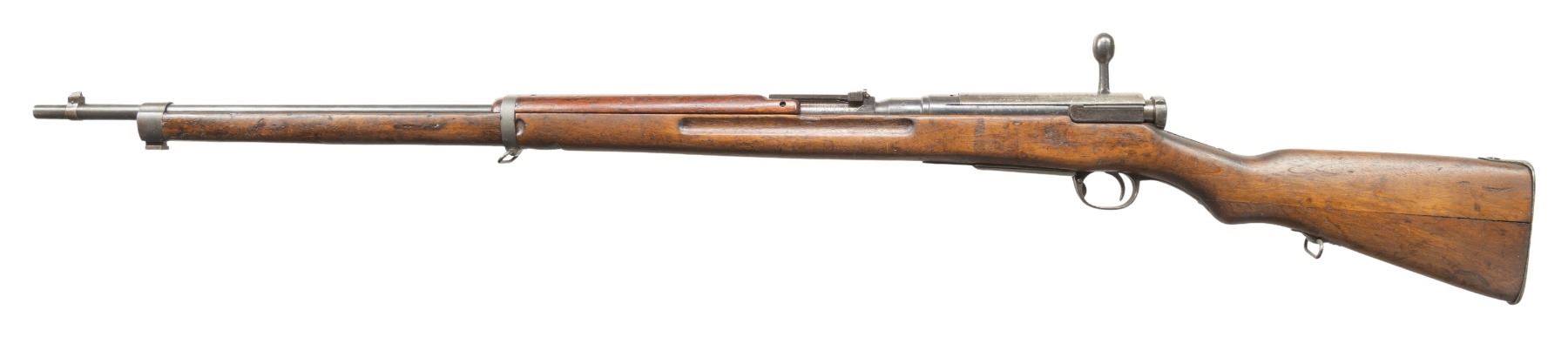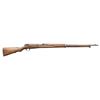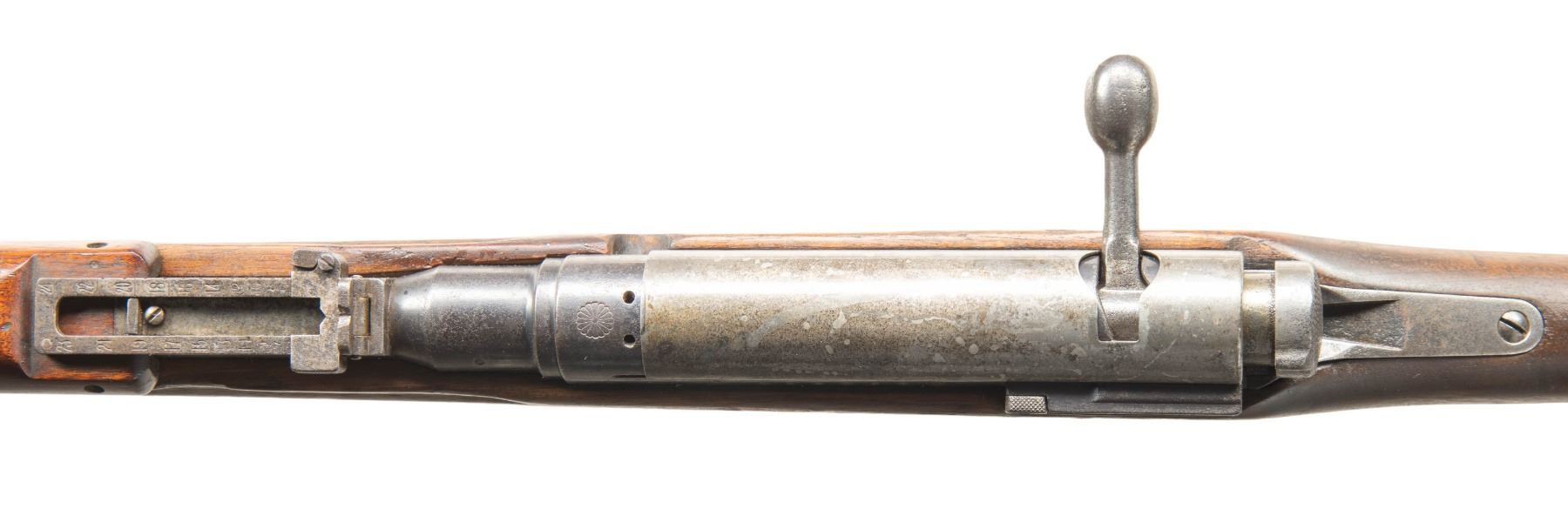 Cal. 6.5 S# 455417. Bbl. 31 1/2". Blade front sight. Ladder rear sight graduated to 2400m. Parts have mixed assembly numbers. Receiver ring has fully intact mum & Type 38 markings. Mismatched dust cover present. Blued finish. Asian hardwood stock set with bottom mounted sling swivels. No cleaning rod present. CONDITION: refinished stock set shows some small cracks, synthetic putty repairs, a couple large gouges on forend, dings & handling marks. Metal retains perhaps 40% blue with areas having a cleaned gray appearance, parts being proud of wood, scattered oxidation, black staining & pitting. Safety not engaging but action is otherwise functional when hand cycled. Pitted bore with evident rifling. (25-6590/MJC). CURIO. $200-400.