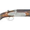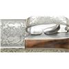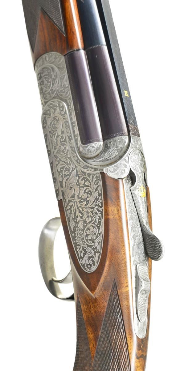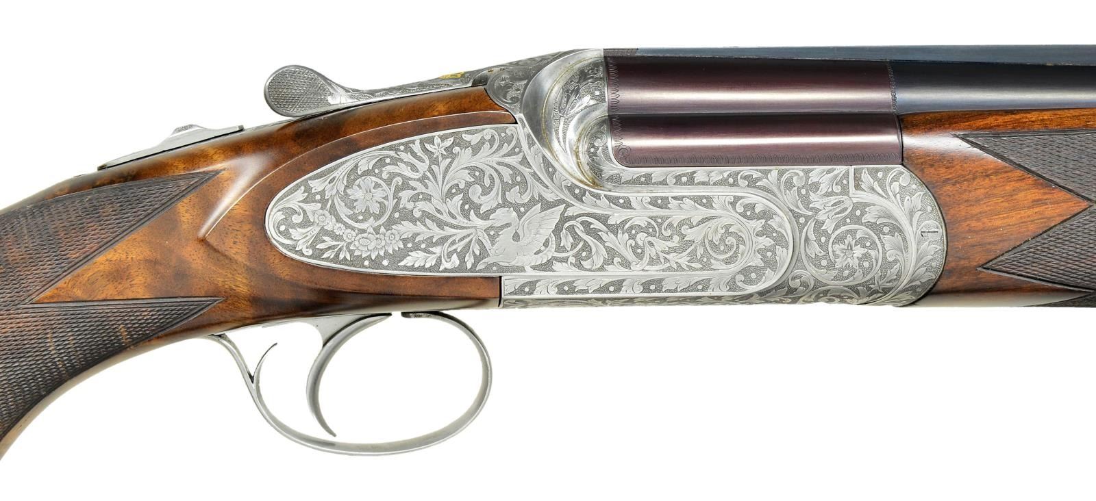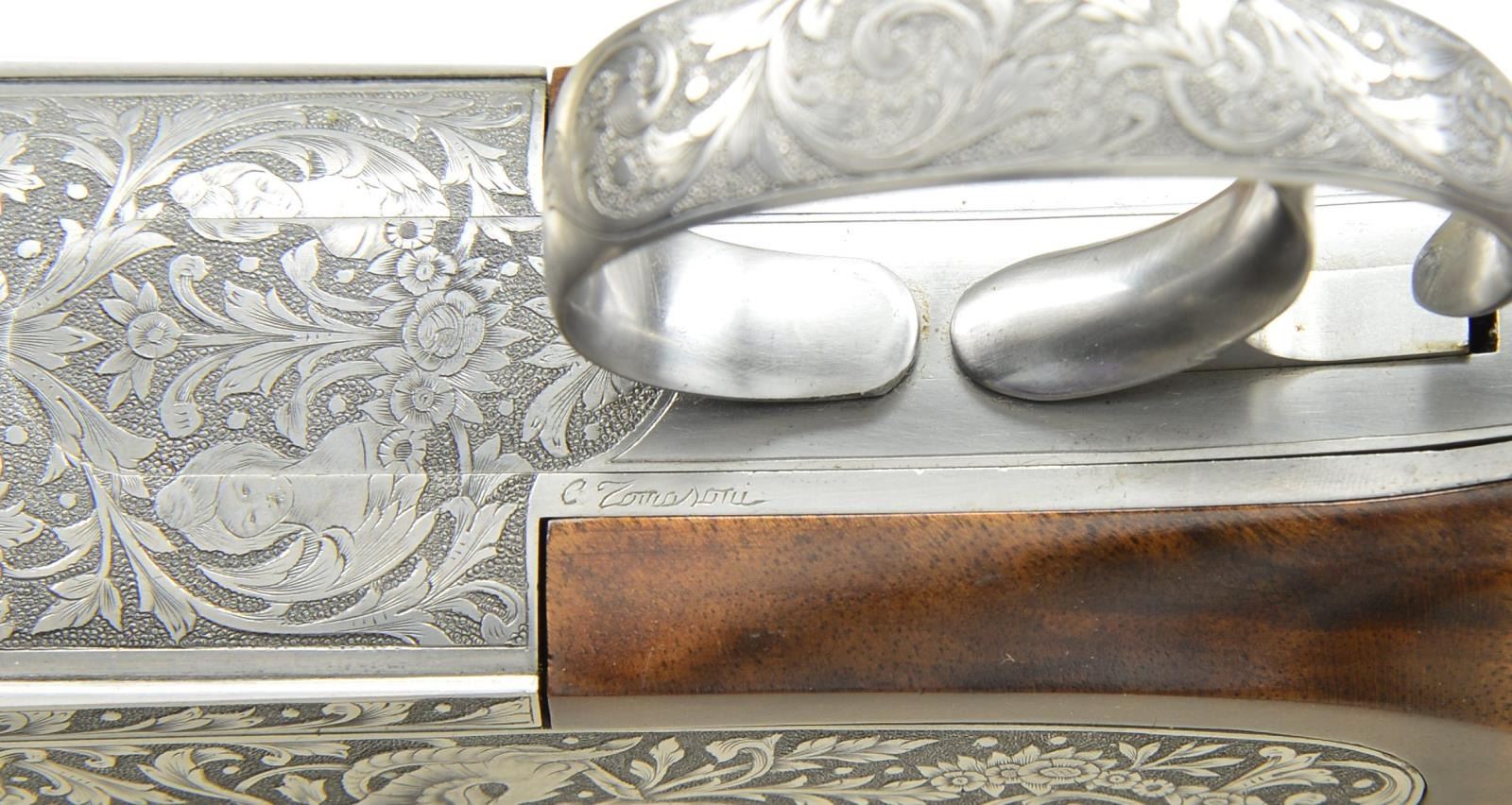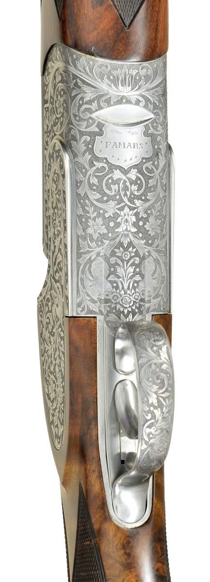SPORTING DELUXE O/U SHOTGUN WITH EXTRA BARRELS, AND TRIGGER GROUP. Cal. 12 ga. 2 3/4". S# F0099 / F0100. The 28 & 29 3/4" monobloc O/U barrel sets are each fitted with matted ventilated ribs that are gold inlaid "I" and "II" at breech ends. Both barrel sets are engraved "Famars Italy" on left side of top barrel and monoblocs are stamped with 1997 Italian Nitro proofs for 2 3/4". 28" Barrel set "I" (SN F0099) have bottom barrel fitted for choke tubes and top barrel choked mod. 29 3/4" Barrel set "II" (SN F0100) has choke tubes top & bottom. Coin finished Famars "Excalibur" type action with removable trigger group is also fitted with ornamental sideplates. Action and lockplates are engraved with near full coverage very nicely cut semi relief large acanthus scroll with some floral highlights on sideplates. Rear portion of this scroll emanates from the mouth of stylized dragons. Large scrolls on bottom of action terminate in the busts of lovely ladies with floral accent between. "FAMARS" is on shield like device behind forend iron mortice. A gold sovereign's crown is inlaid on top lever. Engraver's signature "C. Tomasoni" is on right side of lock mortice. Extreme pistol grip buttstock of exhibition quality burl figured European walnut measures 14 3/4" over thin black "Decelerator" pad. Well cut point pattern checkering is at grip which has right hand palm swell. Near fully checkered slim field type forend with Anson type release services both barrel sets. MEASUREMENTS WITH BARREL SET II: STOCK: DAH: 1 7/8". DAC: 1 3/8". LOP: 14 3/4". CAST: approx. 3/8" off. WEIGHT: 8 lb. UNATTACHED ACCESSORIES: gun comes in brown leather trimmed "Famars" plastic case with outer cover. Interior is lined in green velvet and has compartment for both barrel sets in lid. Divider has black leather "Famars" label. Case contains stock removal tool, one Briley series 1 choke tube with wrench and a spare firing mechanism in plastic case. CONDITION: fine as lightly refurbished, barrels retaining nearly all of a good quality reblack with some minor subsequent marks. Coin finish of action shows evidence of some very light cleaning, engraving remains sharp. What appears to be newer buttstock retains essentially all of its original oil finish, checkering still light in color. Forend shows refinish to match. Checkering with some wear and cleaning. Bores are bright and shiny. Mechanically fine. Case is very good to fine, interior with considerable soiling and marks. Outer cover is very fine and relatively new. (22-4471/MGM). MODERN. $10,000-15,000.