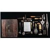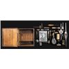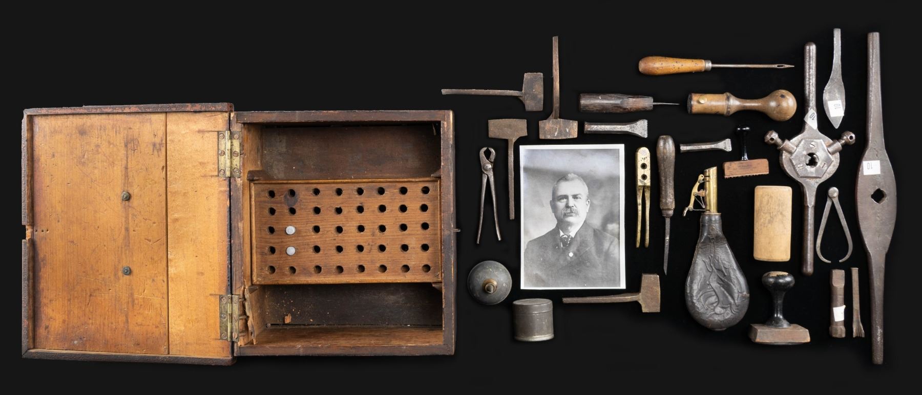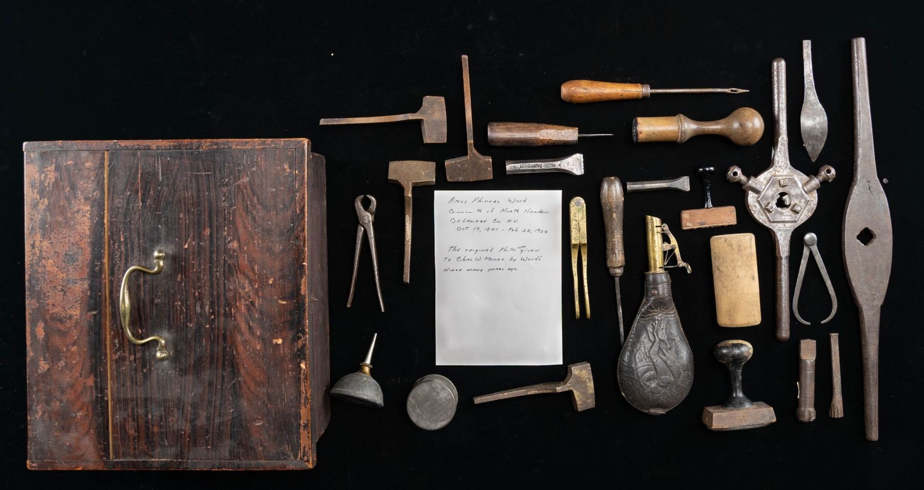 Early wooden shooters box approx. 11" x 10" x 5" able to house 40 lead bullets; box contains 2 bullets, cap tin & oil bottle. CONDITION: items appear to have a gray patina appearance overall with spots of corrosion & crack in large threading tool, but appear mostly intact. (02-25744/MD). NON-GUN. $500-700.