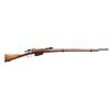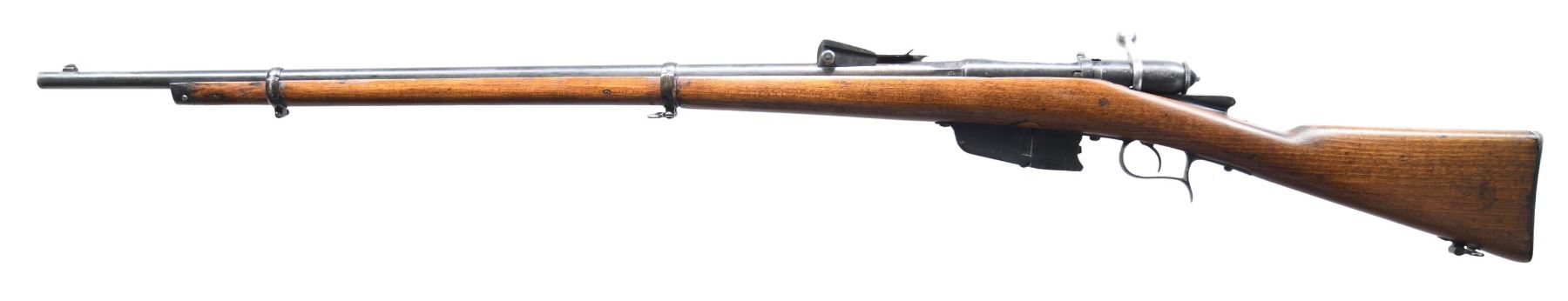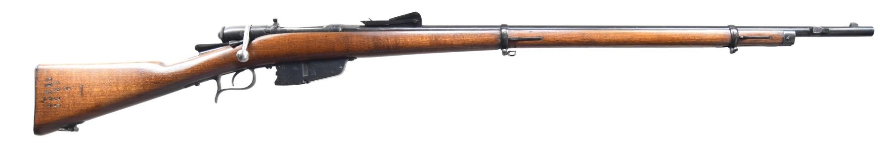 Cal. 6.5 Carcano. S# G8250. Bbl. 33 1/4". Blade front sight. Ladder rear sight graduated to 2000m. Stock has been arsenal force matched to bbl. Bolt WW1 update of an Italian Vetterli rifle to 6.5 Carcano. Bbl. has 1874 date & Torino arsenal markings. Dull reblue finish. Beech stock set with bottom mounted sling swivels & faint left side roundel. No cleaning rod present. CONDITION: refinished stock shows scattered dings & handling marks. Metal retains 75% reblue with a few spots of light pitting, scattered fading to gray, oxidation & edge wear. Action functions properly when hand cycled. Dark bore with scattered pitting & oxidation. (01-27206/MJC). ANTIQUE. $200-400.