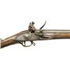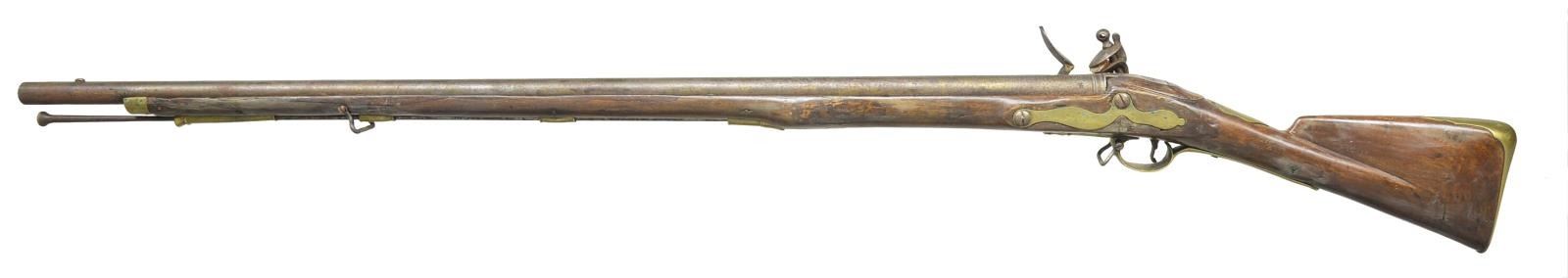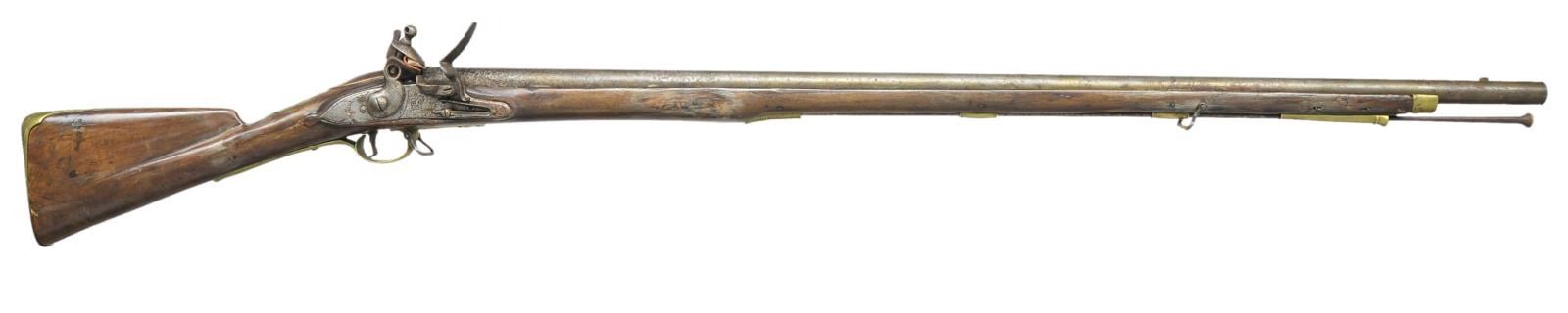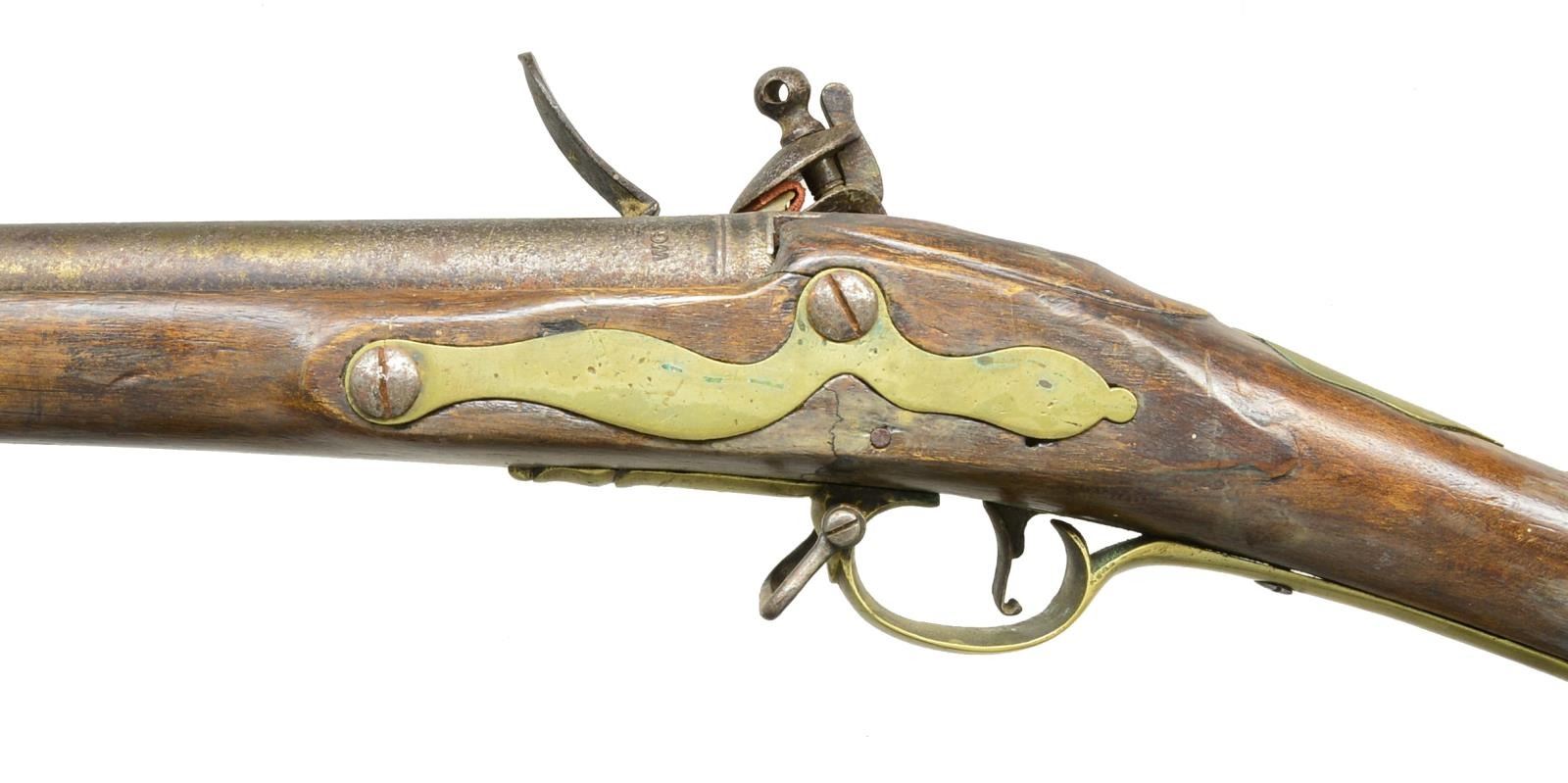 Cal. 73. NSN. 42" Rnd. bbl. is marked “WG” at breech end. Tower marked lock has crown at center stamped “GR”. Cock is reinforced. Frizzen is bridled & feather spring has spear finial. Stock extends to w/ in 4 1/2" of muzzle w/ brass cap & is brass mounted w/ later style furniture including flat serpentine sideplate, trigger guard w/ sm. finial & buttplate w/ steeple shaped top tang. Stock also features deeply fluted comb, palm swell at front grip & raised platform around bbl. tang. CONDITION: fairly good, original flintlock. Metal parts cleaned to gray w/ considerable deep pitting; especially at breech area of bbl. Stock w/ old varnish refinish has a number of repairs around mounting pins & w/ replacements along bbl. channel. (01-19183/MGM). ANTIQUE. $1,000-2,000.
