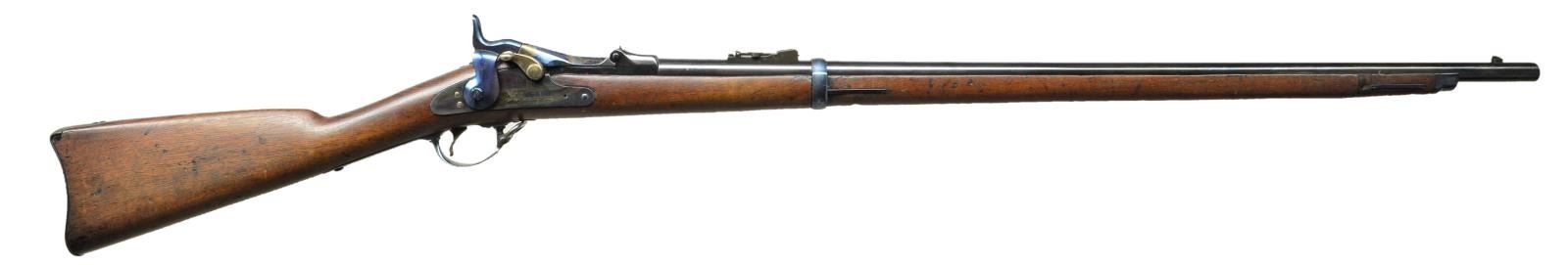 Cal. 45-70. S# 27632. Bbl. 32 5/8". Early rifle w/ fixed front & 1873 rifle rear sights. Breechblock dated 1873, w/ later 3 click tumbler. Ramrod & upper bbl. band are missing. CONDITION: metal has been amateurishly reblued/recase colored. Stock has been sanded w/ no visible marks & numerous dings, dents & gouges. Bore is fair w/ visible rifling, dark & lightly pitted. (01-22266/CW). ANTIQUE. $250-400.