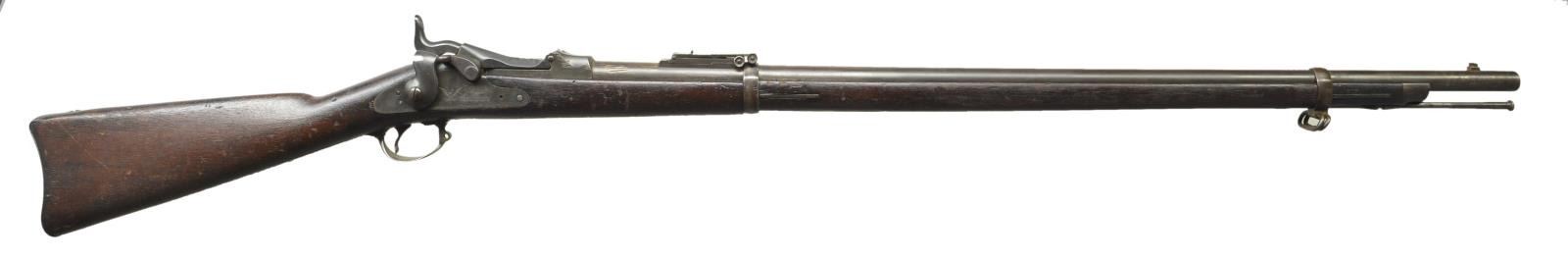 Cal. 45-70. S# 393572. Bbl. 32 5/8". Fixed front & Buffington rifle rear sights, 2 bbl. bands, ramrod & 1884 marked breechblock. CONDITION: metal is a blue/gray patina w/ freckling & light rust. Wrench marks on the breech end bbl & front of frame. Stock has no visible markings w/ chipping, dings & dents throughout. Bore is good, strongly rifled but a bit dark w/ some scattered pitting. (01-22067/CW). ANTIQUE. $400-600.