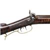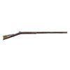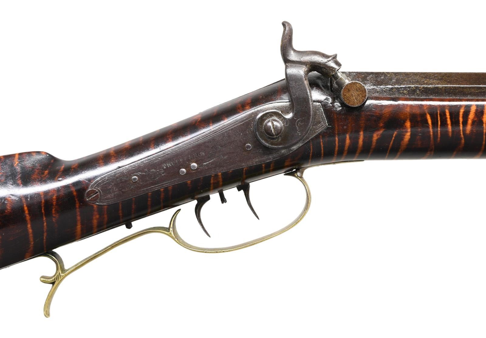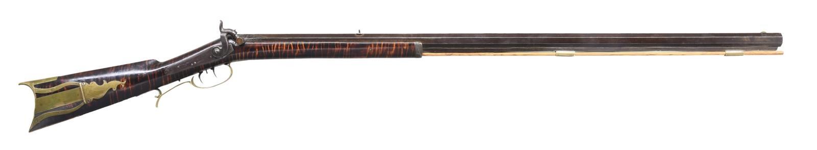 PERCUSSION KENTUCKY RIFLE. Cal. 40. NSN. Bbl. 37". Half-stock Kentucky percussion rifle, with a "TRUITT BROS/ & Co" marked lockplate. Top flat of heavy octagonal bbl. is marked "J. TROXER". Tiger maple buttstock features a brass buttplate, patchbox, trigger guard, and ramrod ferrules, with a pewter nose cap. German silver blade front sight with V-notch rear sight. Double set triggers. CONDITION: iron components retain a dark gray patina overall, with the lockplate and bbl. exhibit areas of corrosion around the percussion bolster. Brass components exhibit a mellow patina, with the trigger guard appearing to have been cleaned at one time. Buttstock exhibits some scattered marks and small impressions from handling and storage, with a small repaired chip on the right side near the nose cap, as well as a hairline crack that is stems from the breech of the bbl. on the left side. (01-24927/MLW). ANTIQUE. $600-900.