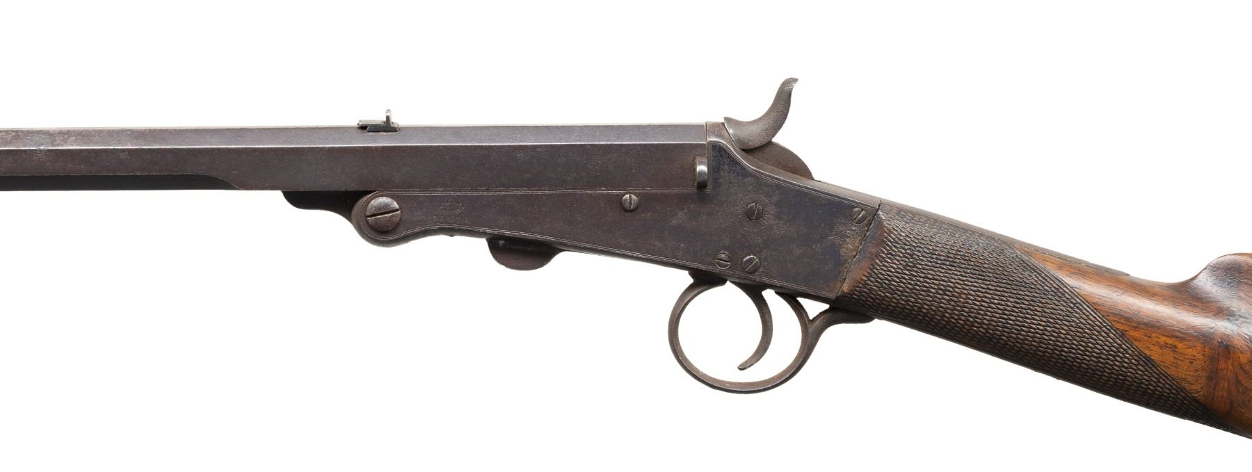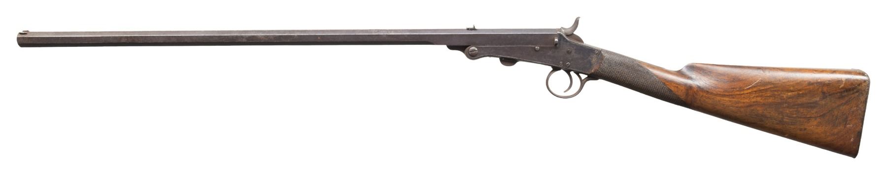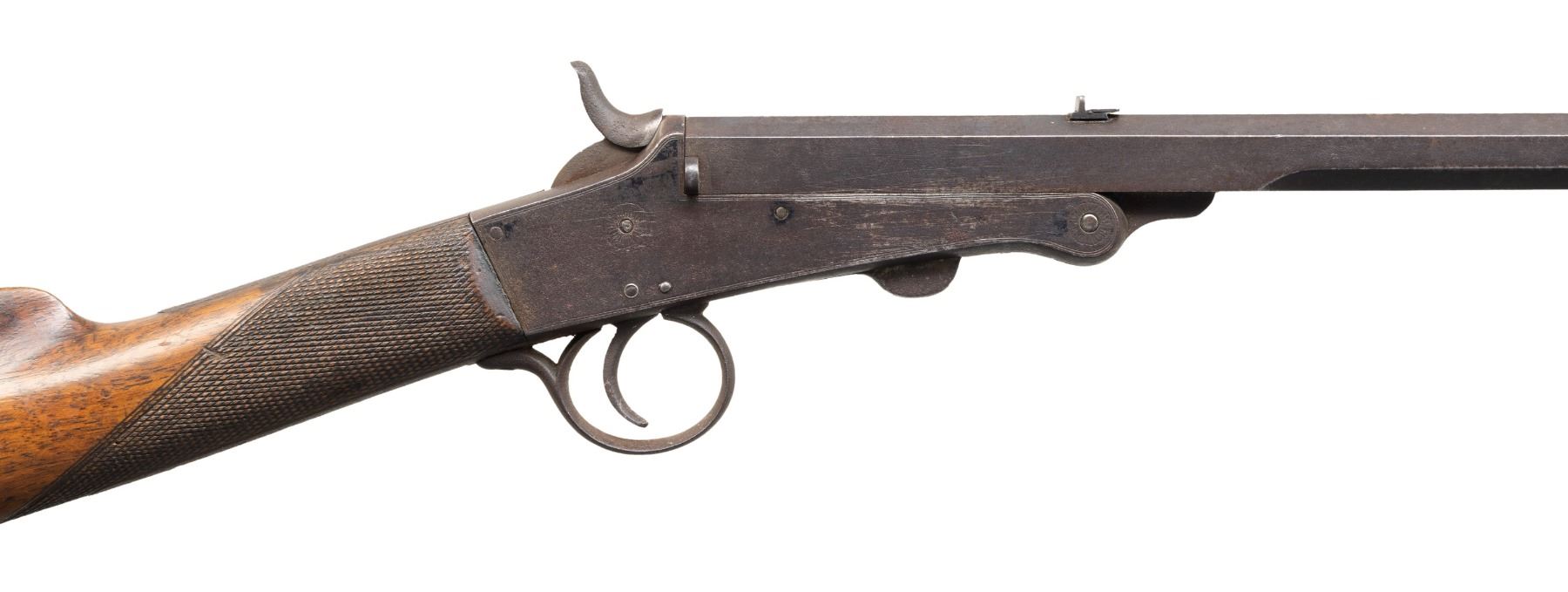 TRANTER'S PATENT ROOK RIFLE. 380 Rook. S# 89 (Tranter Patent #35075). Oct. 26" bbl. w/ Birmingham black powder proofs. Tranter's patent action w/ external hammer & tilting extractor. Checkered walnut stock w/ steel buttplate. CONDITION: metal has oxidized appearance overall with cleaning around bbl. address & traces of blue. Wood has numerous dings & marks with light wear to checkering. Strong rifling with pitting & frosting. Mechanically fine. PROVENANCE: Estate of Groves Herrick. (01-28365/MD). ANTIQUE. $400-600.