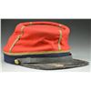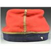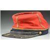 ARTILLERY OFFICER’S RED KEPI. A splendid example of a Confederate Civil War Artillery Officer’s kepi made of red wool broadcloth. There is a dark blue band of similar cloth & weave at the base of the crown. The kepi measures 6 1/2" from the lower rear edge to the top of the crown, including the roll. It measures 3 5/8" from the lower front edge to the crown, including the roll. The dark blue band is 1" wide tapering to 1 1/8" at the rear seam. The diameter of the crown is 4 3/4", excluding the roll. There is 1/4" gold bullion trim covering the seam between the red & blue wool, as well as adorning the front, rear & sides of the kepi rising from the band to the crown. The outside of the crown is trimmed in 1/4" gold bullion tape. Pasteboard is used for a backing on the cap band and is also possibly used as a stiffener in the crown. The visor is made of tarred linen with a tarred linen sewn binding at the edge. The 1/2" chinstrap also appears to be stiff tarred linen with no buckle, but 2 slide adjustments. The chinstrap attaches to the band with 2 cuff-sized eagle general service buttons. The inside of the crown is also lined with the same tarred linen material. The sweatband is tarred linen, but much thinner than seen in the crown & visor. The lining is a wonderful folky cotton material showing an underlying plaid pattern utilizing tan, yellow, brown & light blue. This kepi is one of the finest Confederate Artillery kepis we have seen and every aspect of this kepi sings Dixie. Not only is the kepi visually attractive & impactful, its historic significance cannot be understated. CONDITION: the red & blue wool remain bright & vivid. There is scattered light mothing on the red crown & the blue band. The moth nips in no way compromise the integrity of the hat, but rather attest to its 160 year history and its hard life on the battlefields of the Civil War. The chinstrap & visor are quite strong, yet show expected wear. The sweatband appears nearly complete and has a few minor separations. The lining has ample sweat stains and shows some separation to the cotton material. (02-19579/BF). $7,000-10,000.