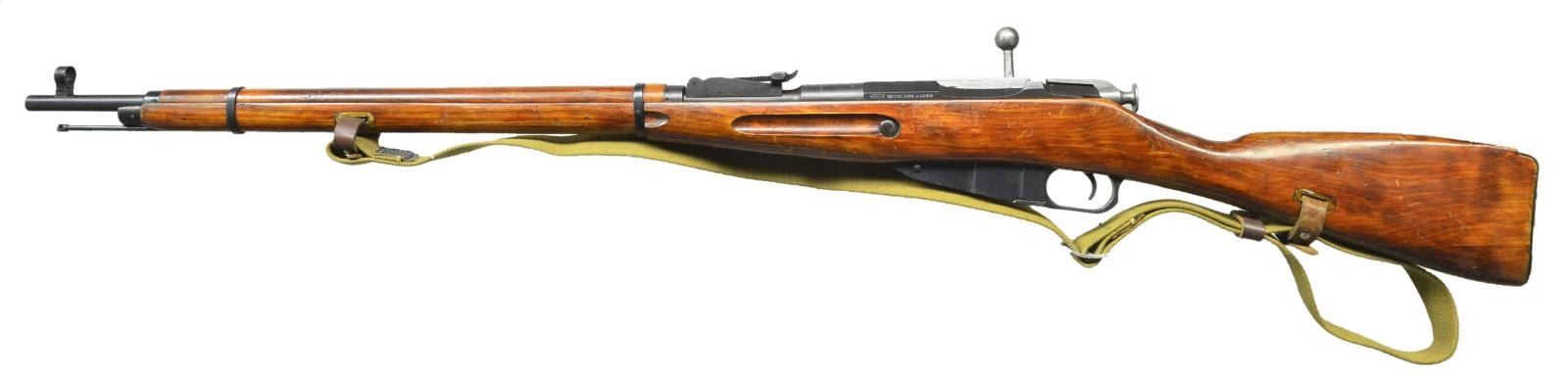 Cal. 7.62x54R. S# A9324. Bbl. 29". All numbers are matching as arsenal refurbished. Top of bbl. shank has Tula "Five line" markings & 1927 date indicating this rifle was converted from dragoon to 91/30 configuration. Hex receiver has sickle & hammer emblem. Left side of receiver has import marking & importer added serial number. Tangent rear sight graduated to 2000m. Post front sight w/ hood. Hardwood stock set w/ toe splice. Pressed in sling mounts. Cleaning rod & Com Bloc style sling present. UNATTACHED ACCESSORIES: 91/30 spike bayonet that is numbered to a different rifle. CONDITION: stock set has arsenal rework finish w/ scattered flaking & handling wear. Metal retains 93% arsenal rework blue. Fair bore w/ scattered frosting & some light pitting. (22-5881/MJC). CURIO. $400-600.